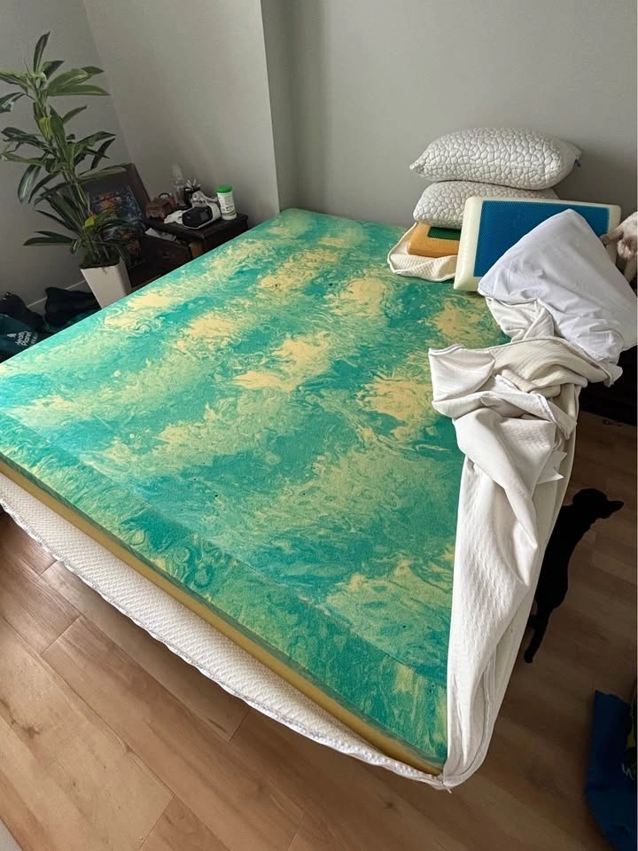 Selling a California King size foam mattress and sturdy metal platform bed frame. This is a high-quality foam mattress from The Foam Store (Kitchener) — not a budget mattress. It is still very supportive and comfortable with excellent shape retention. See photos showing foam compression and immediate bounce-back. Mattress: 83” L x 71” W x 8” thick. Platform height: 13” off the floor (great for storage). Mattress was always used with a protector, is clean, well cared for, has high-resilience foam (still very supportive), and no sagging. Bed frame is a strong metal platform (no box spring needed), very sturdy and stable, and provides excellent under-bed storage space. Bonus: Grey comforter included. Pickup only – no delivery. Mattress has been rolled and zip tied and platform has been disassembled. Mattress is heavy — you will need 2 people to move it. Located in Kitchener.