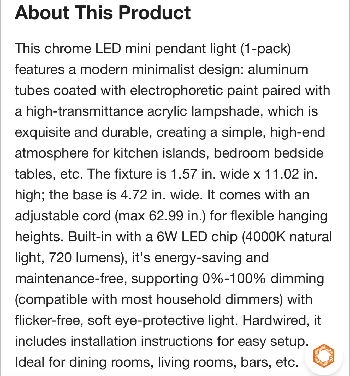 This chrome LED mini pendant light features a modern design with aluminum tubes and acrylic shades. It's 1.57 in. wide x 11.02 in. high, with a base that's 4.72 in. wide. It comes with an adjustable cord up to 62.99 in. for flexible hanging heights. Built-in with a 6W LED chip, it offers 4000K natural light and supports 0-100% dimming. This light fixture would be great for illuminating a kitchen island or dining area.