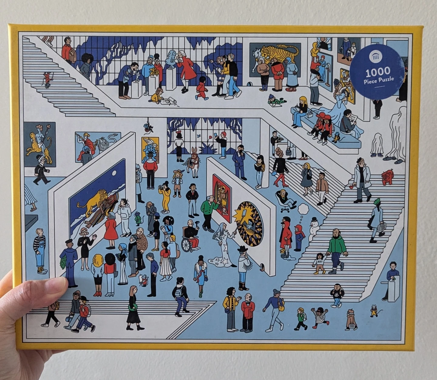 This 1000 piece jigsaw puzzle depicts a busy art gallery scene with many people exploring the exhibits.