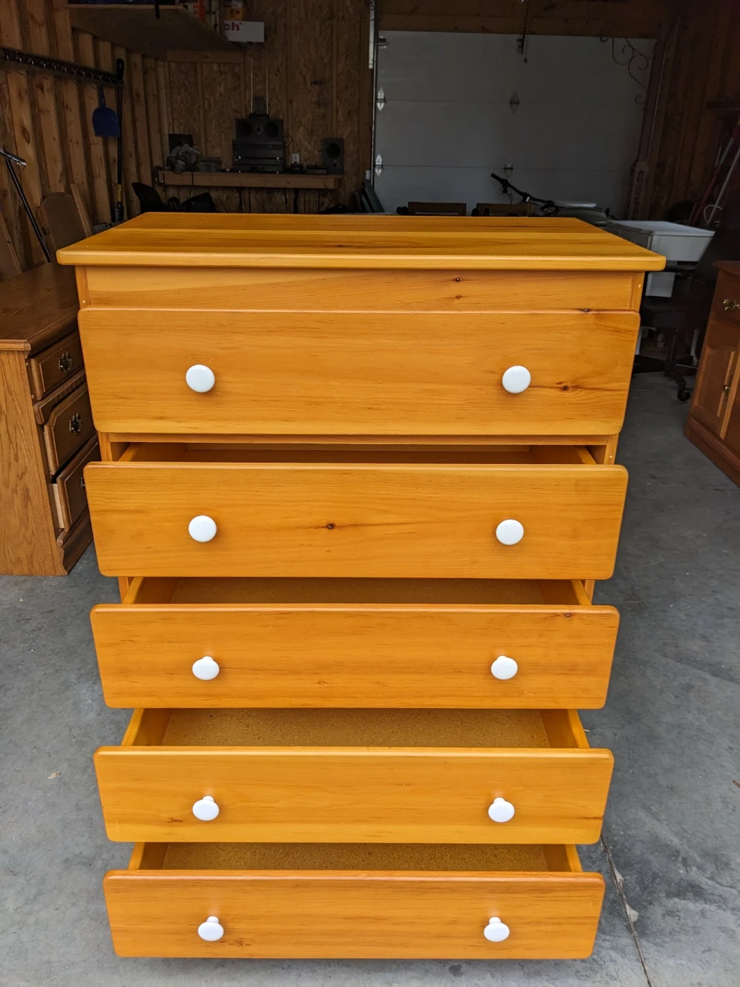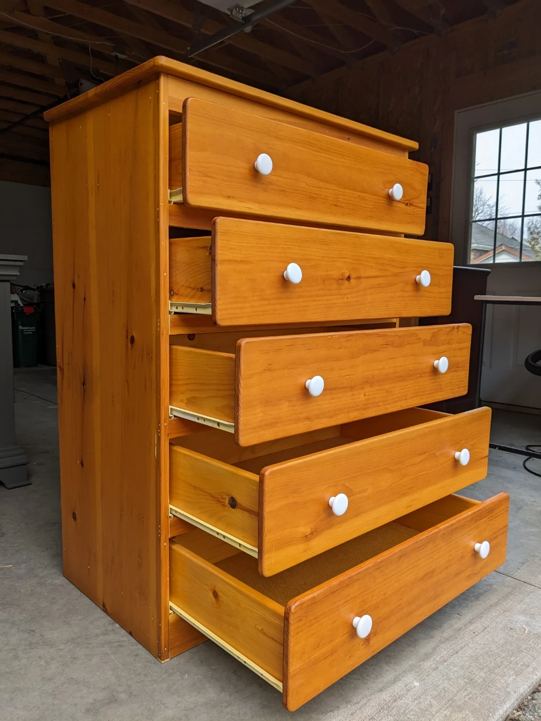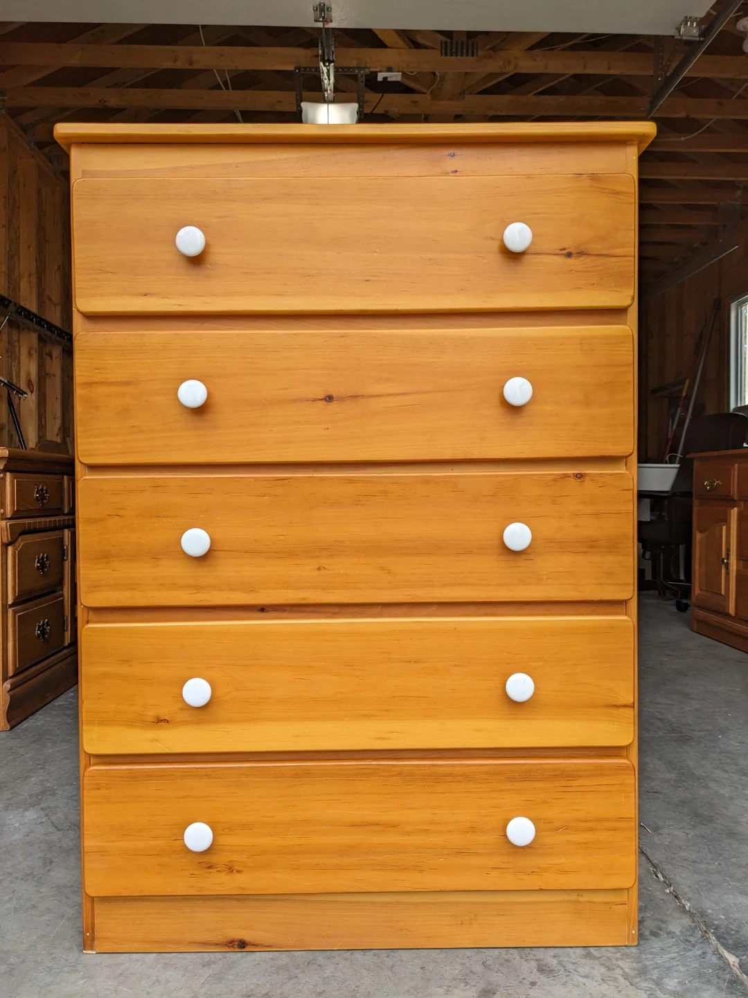 This 5 drawer tallboy dresser in solid pine features spacious drawers that all open and close perfectly on their metal slides with safety stop system. The drawer pulls are made of durable white porcelain.