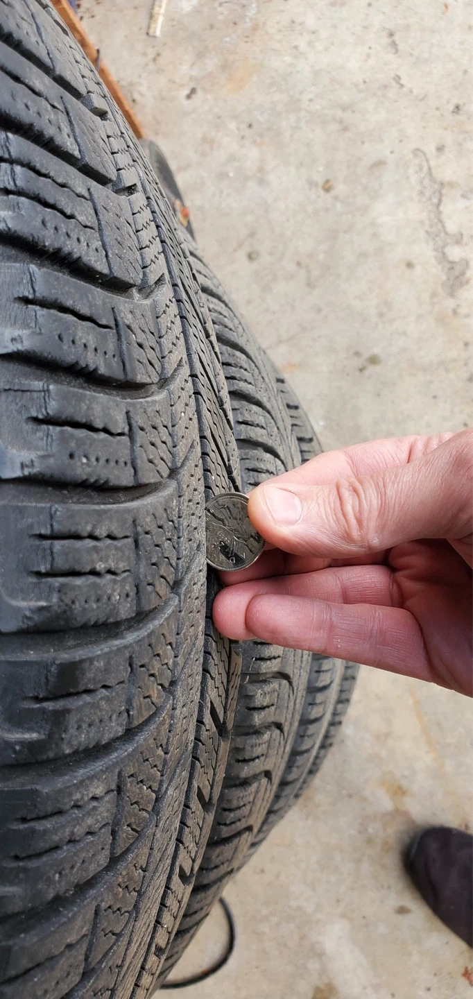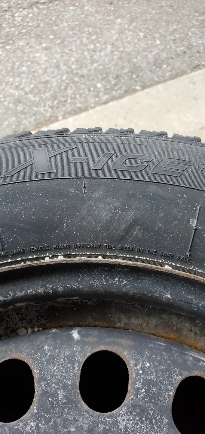 Set of 4 Michelin winter tires mounted on steel rims for Hyundai Tucson SUV. Tire size is 22560r17. Tread depth is good, with approximately 10/32nds of an inch remaining, similar to the height of a toonie.