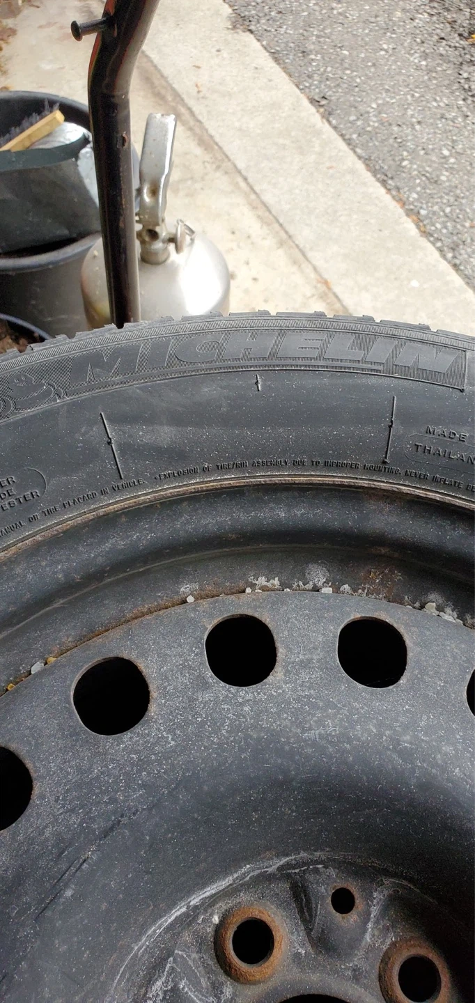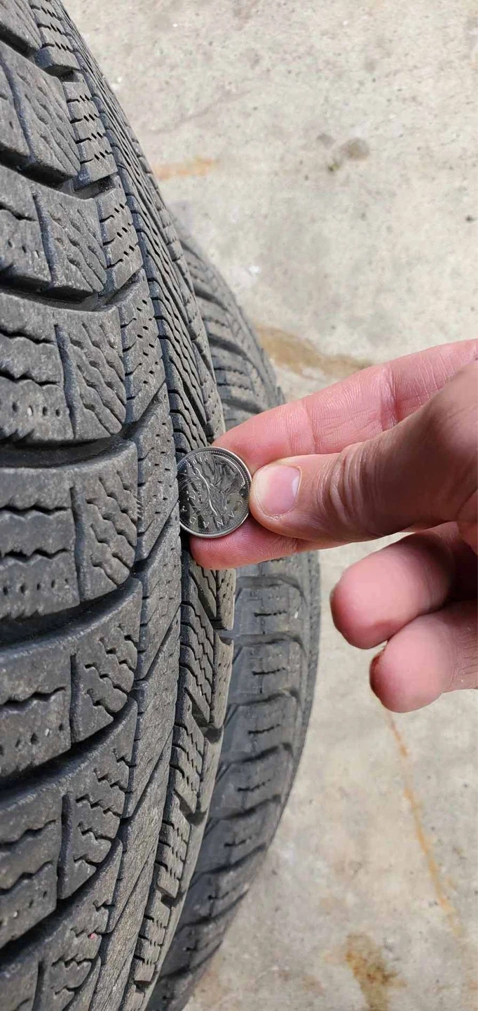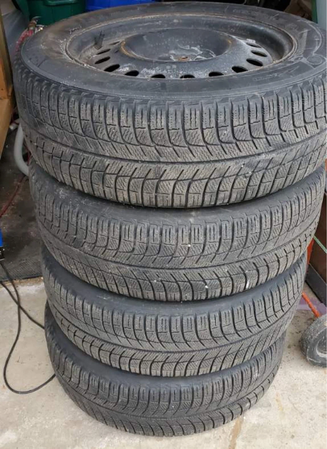 Set of 4 Michelin winter tires mounted on steel rims for Hyundai Tucson SUV. Tire size is 22560r17. Tread depth is good, with approximately 10/32nds of an inch remaining, similar to the height of a toonie.