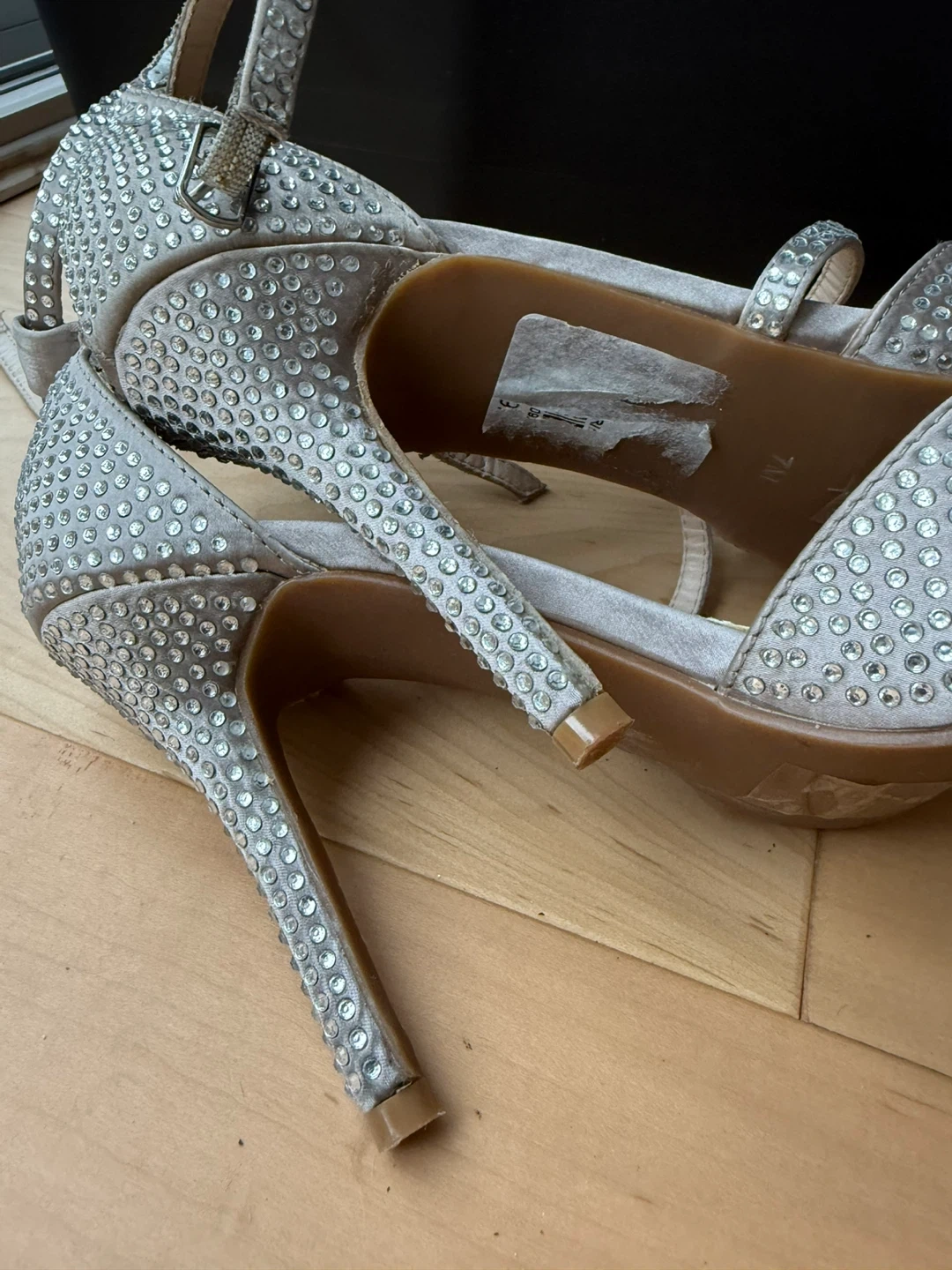 Elegant sparkly silver heels from Le Château. These heels feature a dazzling all-over rhinestone embellishment and an ankle strap for a secure fit. Perfect for special occasions or a night out!