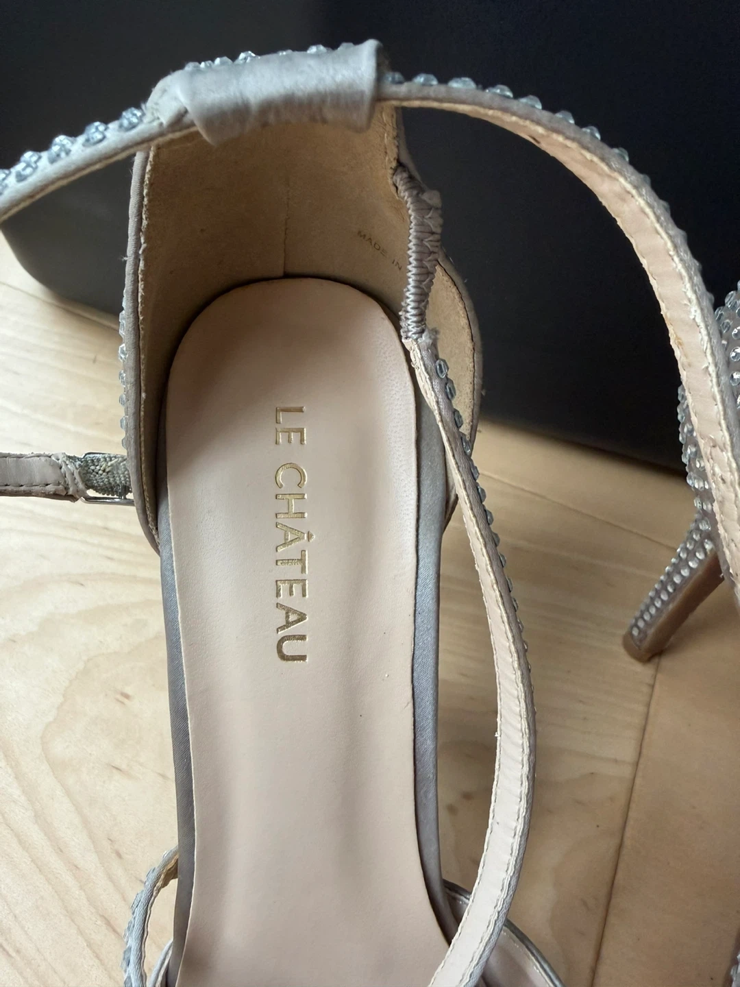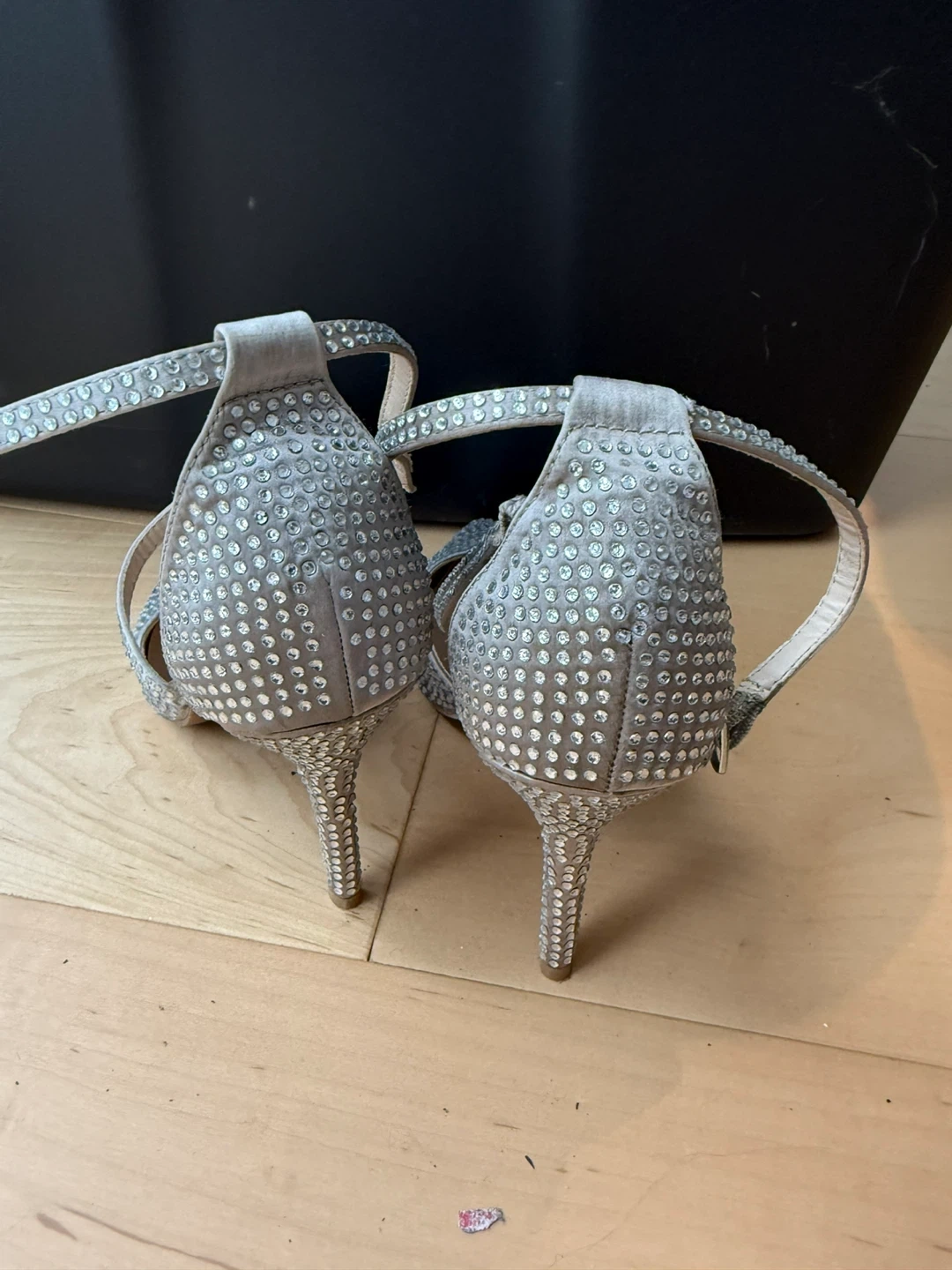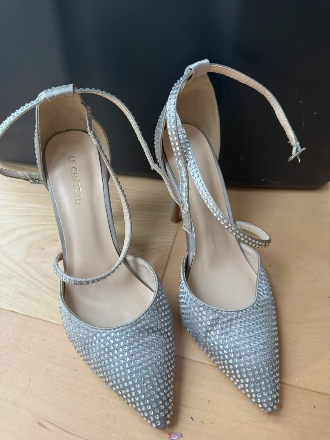 Elegant sparkly silver heels from Le Château. These heels feature a dazzling all-over rhinestone embellishment and an ankle strap for a secure fit. Perfect for special occasions or a night out!