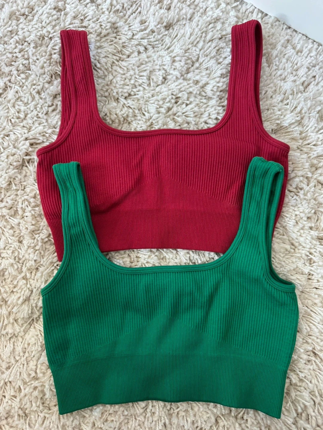 Set of two ribbed tank tops in red and green. Square necklines and a comfortable fit. Ribbed material.