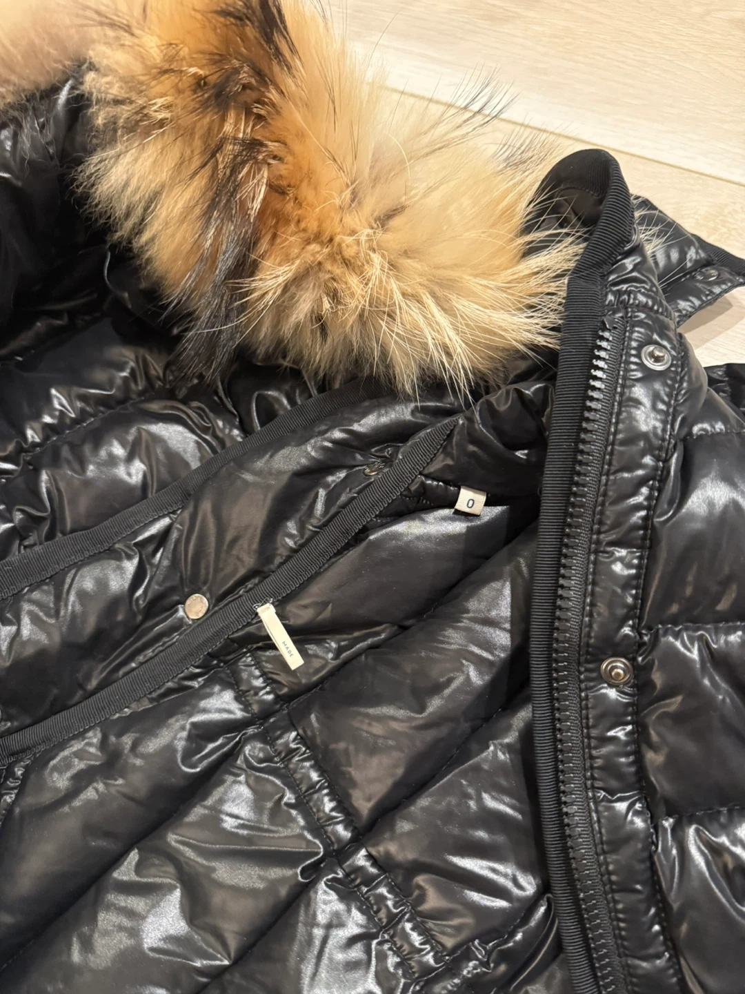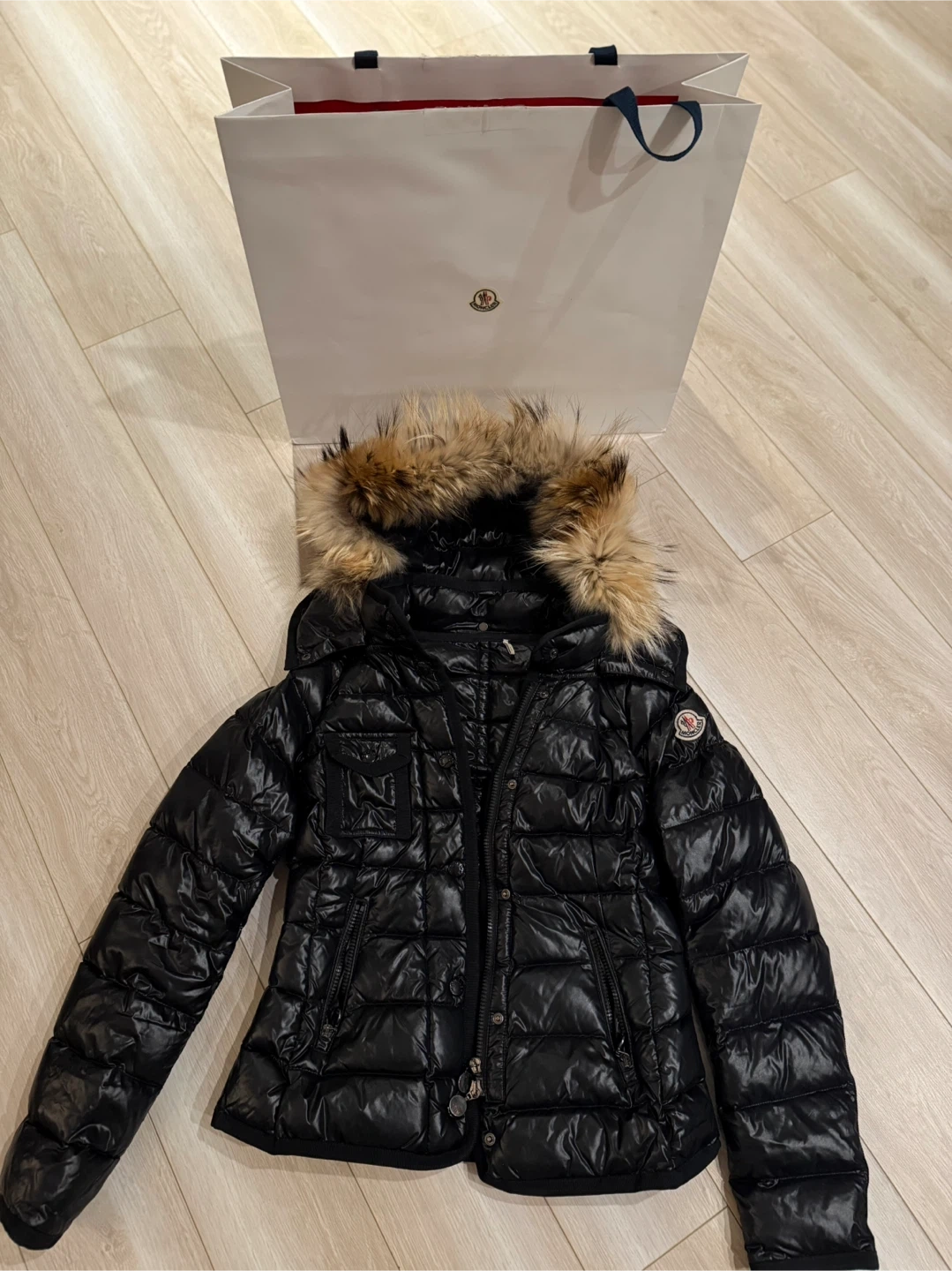 Selling a stylish Moncler black down puffer jacket. It's in great condition and features a fur-trimmed hood that is removable, perfect for staying warm and fashionable during the colder months.