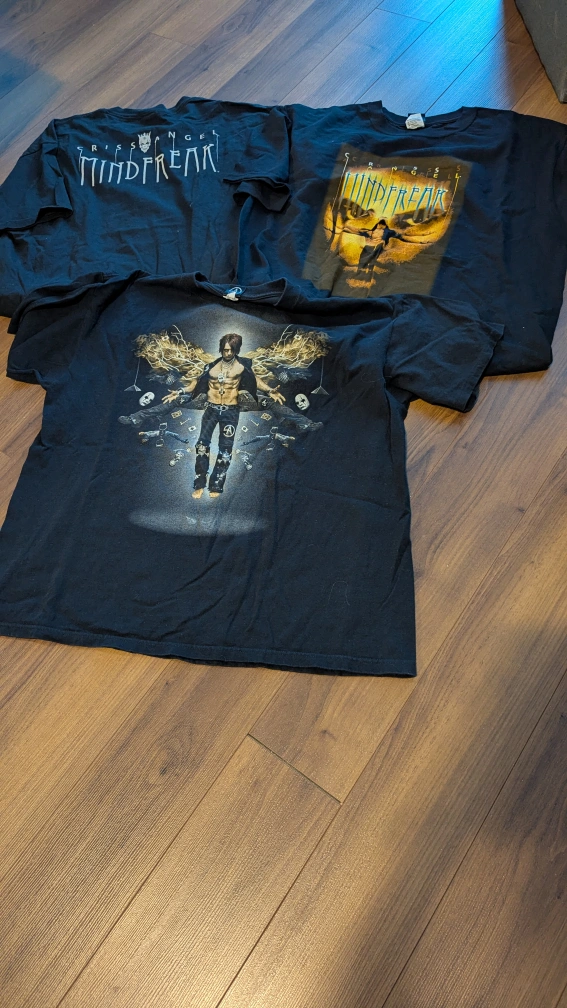 Three black Criss Angel Mindfreak t-shirts. Various designs featuring Angel. Pre-owned.