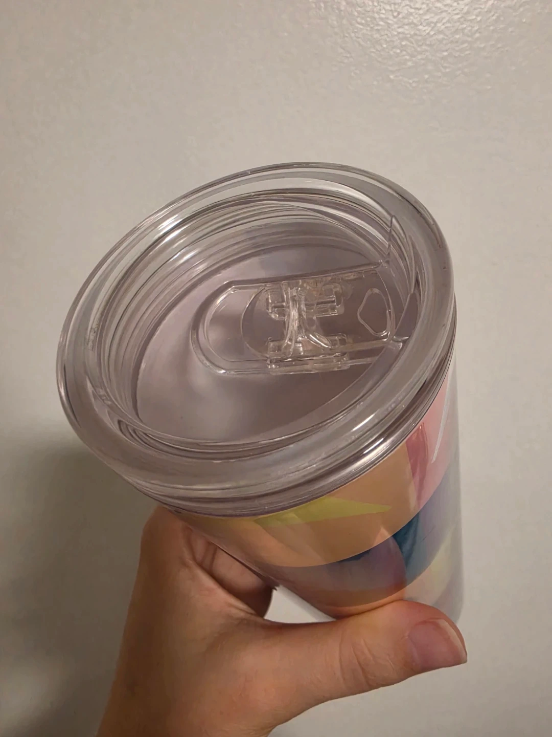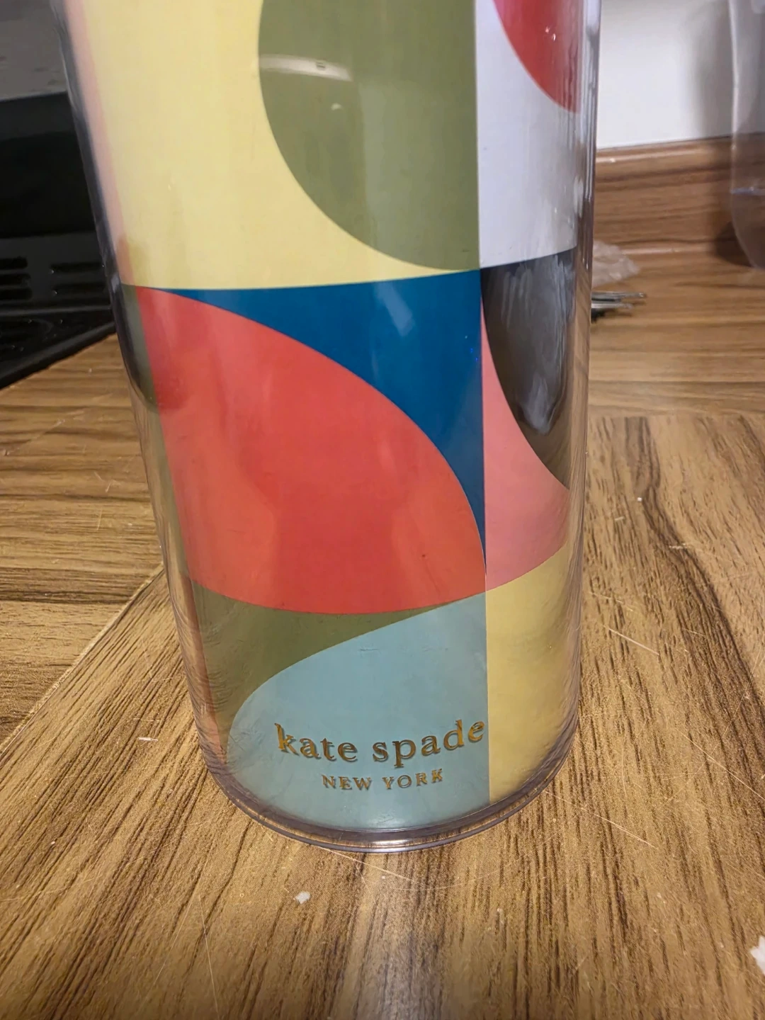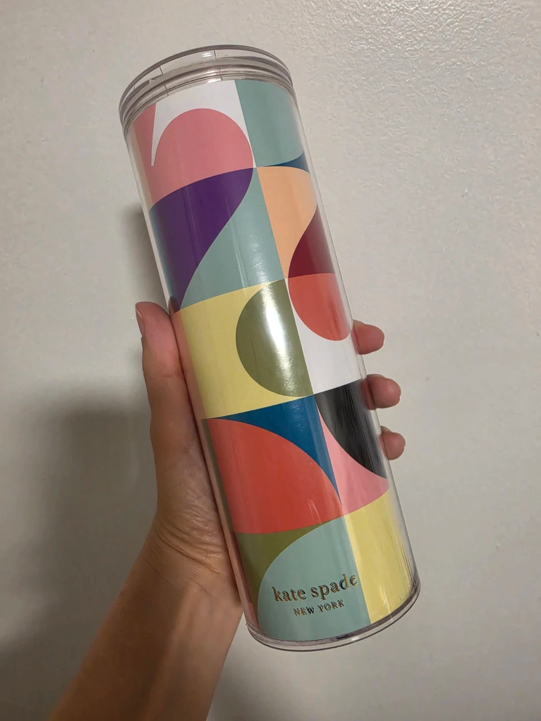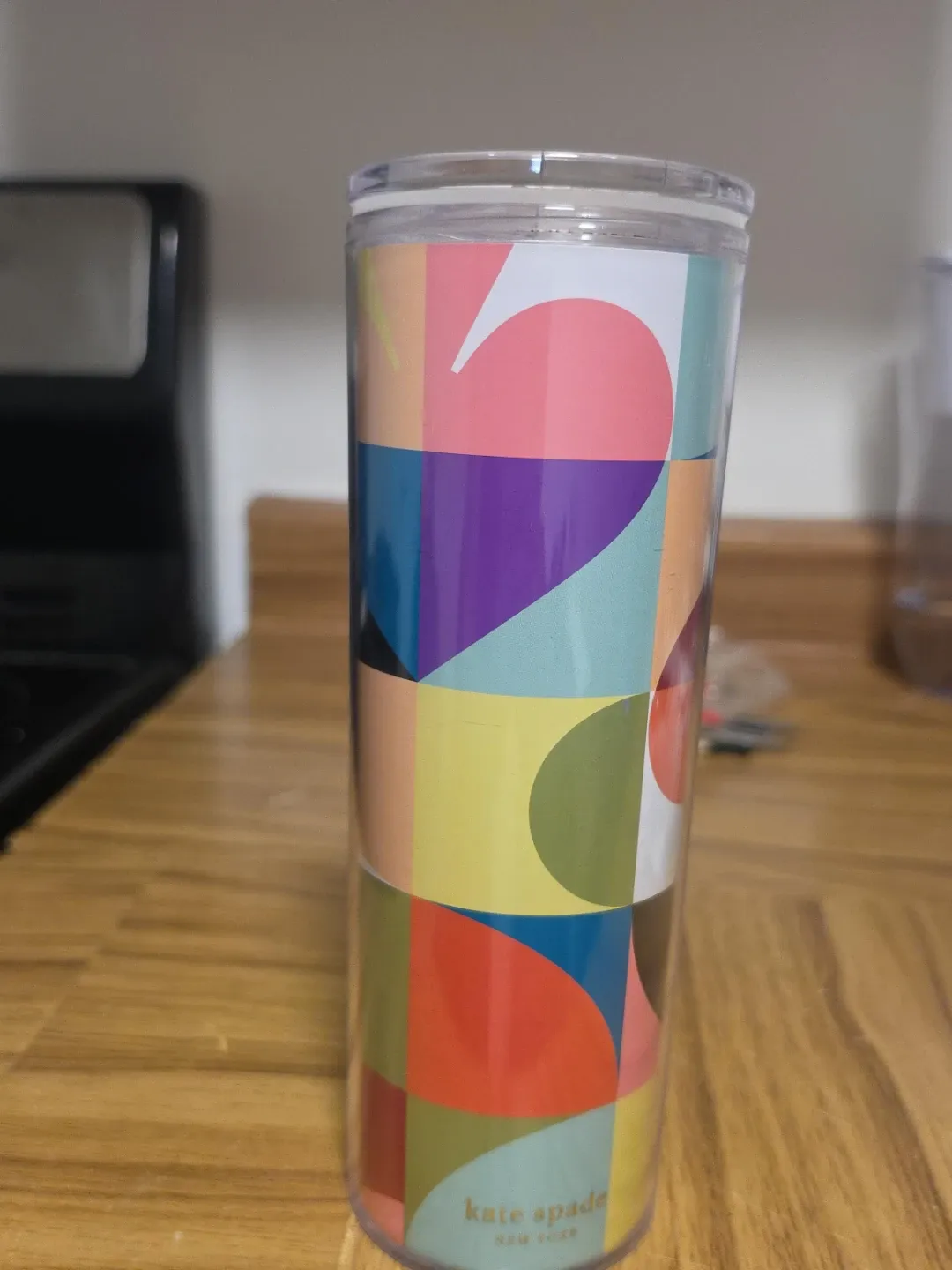 This Kate Spade New York tumbler features a colourful geometric pattern. It's a reusable cup with a secure lid, perfect for on-the-go beverages. Great for cold drinks!