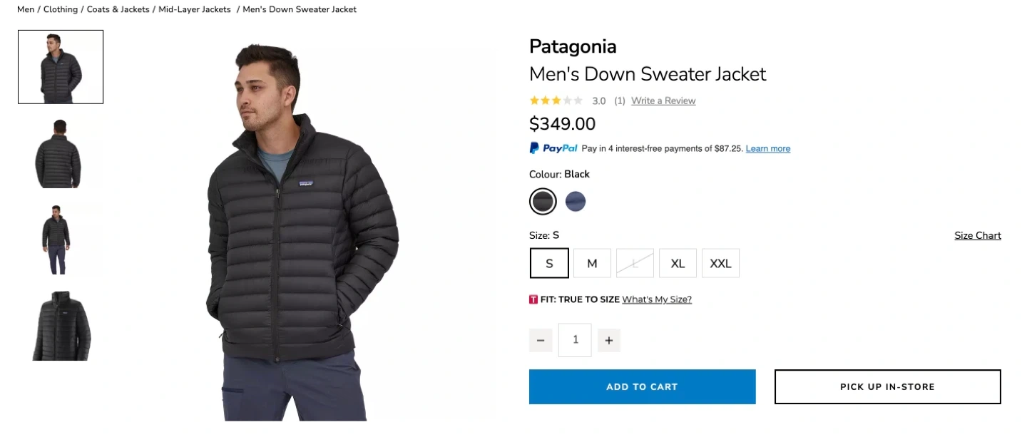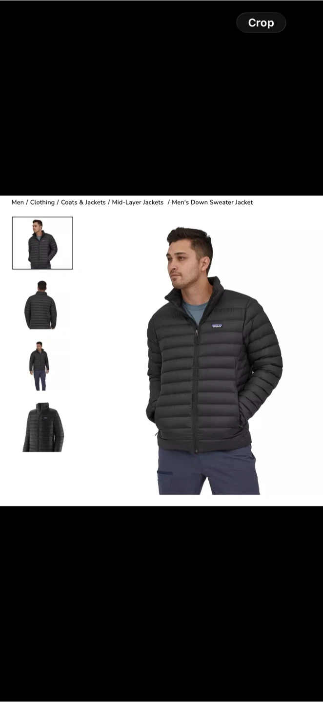 Patagonia men's down sweater jacket. It's black and size small. Filled with down insulation for warmth.