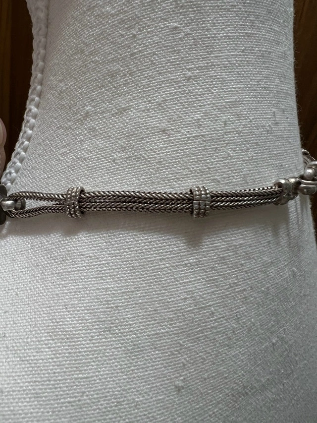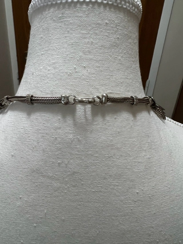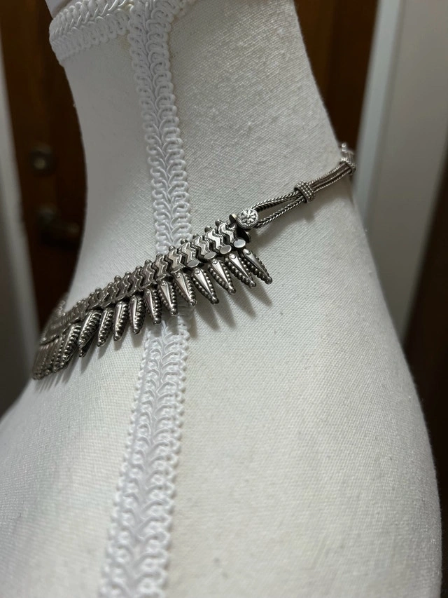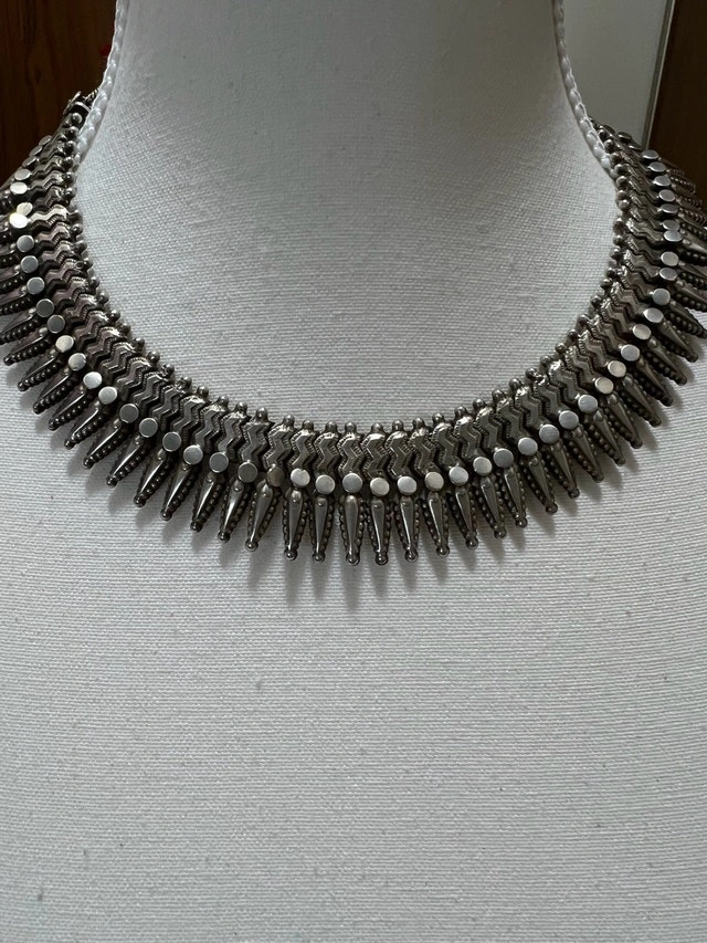 This is a stylish used necklace, perfect for adding a touch of elegance to any outfit. The design features a series of decorative metal elements that create a unique and eye-catching look. I'm not entirely sure what materials the necklace is made from, but it has a nice heft to it. It is in good condition. Treat yourself or surprise someone special with this charming piece! If the ad is still up, the necklace is still available!