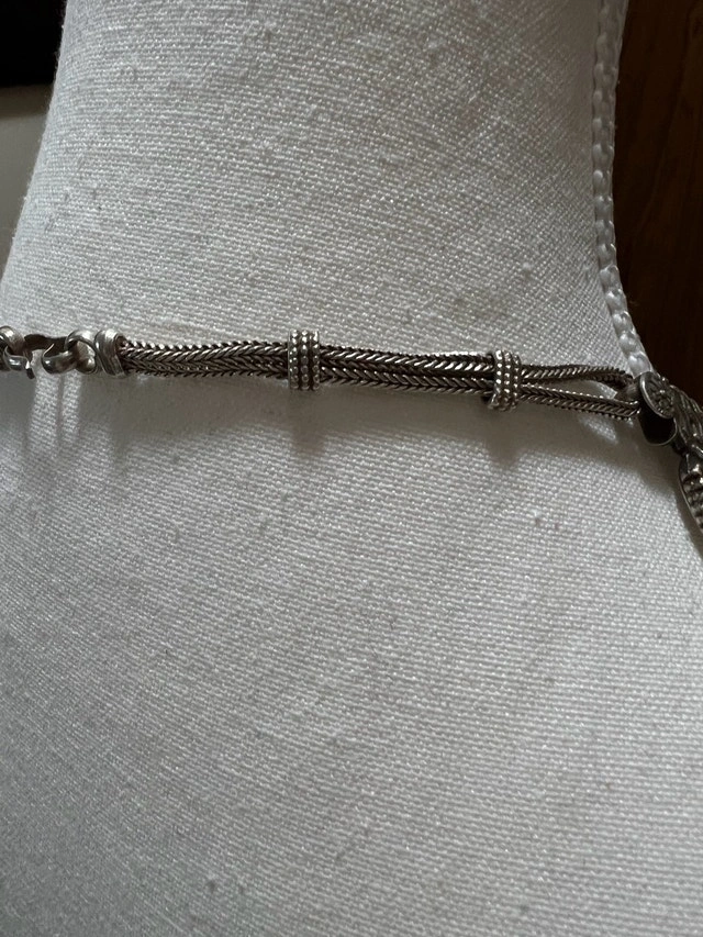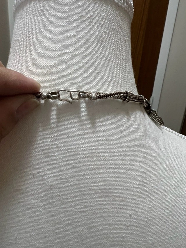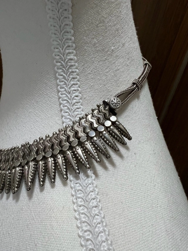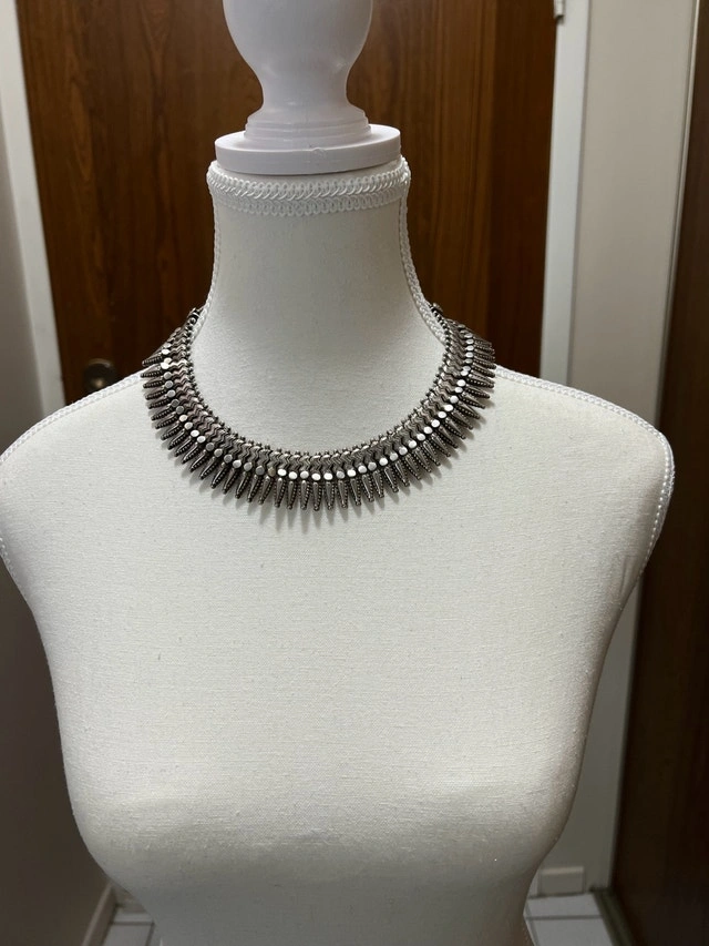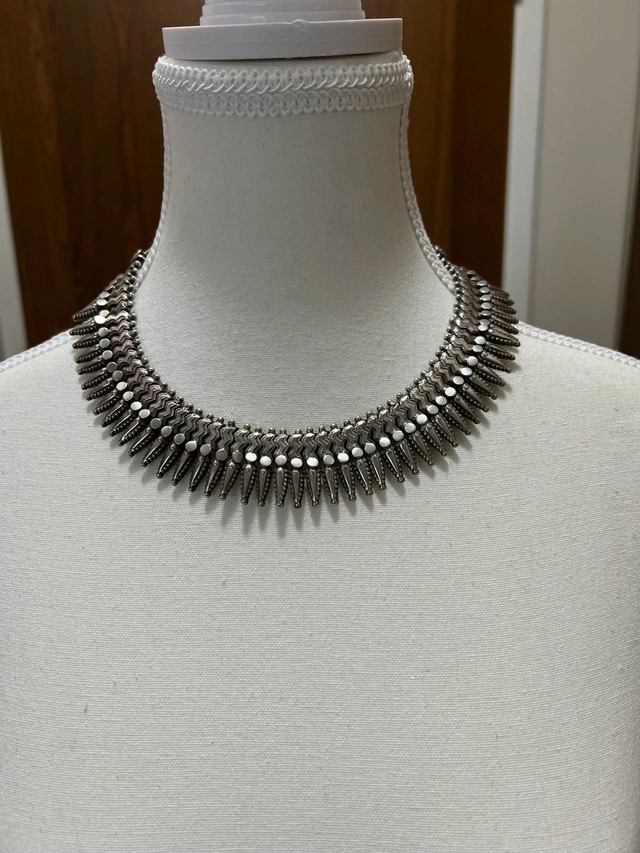 This is a stylish used necklace, perfect for adding a touch of elegance to any outfit. The design features a series of decorative metal elements that create a unique and eye-catching look. I'm not entirely sure what materials the necklace is made from, but it has a nice heft to it. It is in good condition. Treat yourself or surprise someone special with this charming piece! If the ad is still up, the necklace is still available!