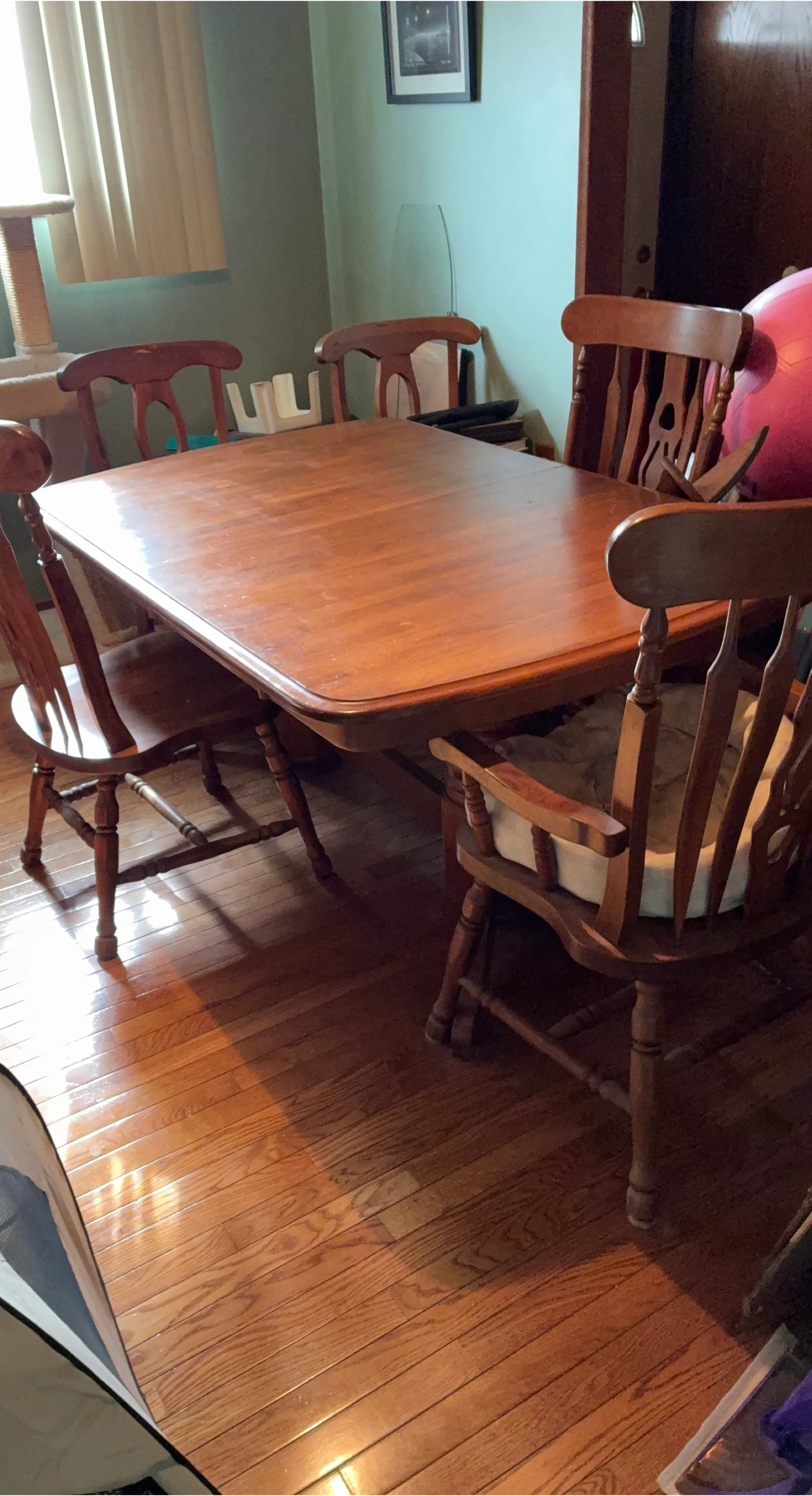 Selling a wooden dining table with six matching chairs. It's a great set for a family or anyone who enjoys hosting dinners. The table and chairs are sturdy and have a classic design that would fit well in many homes.