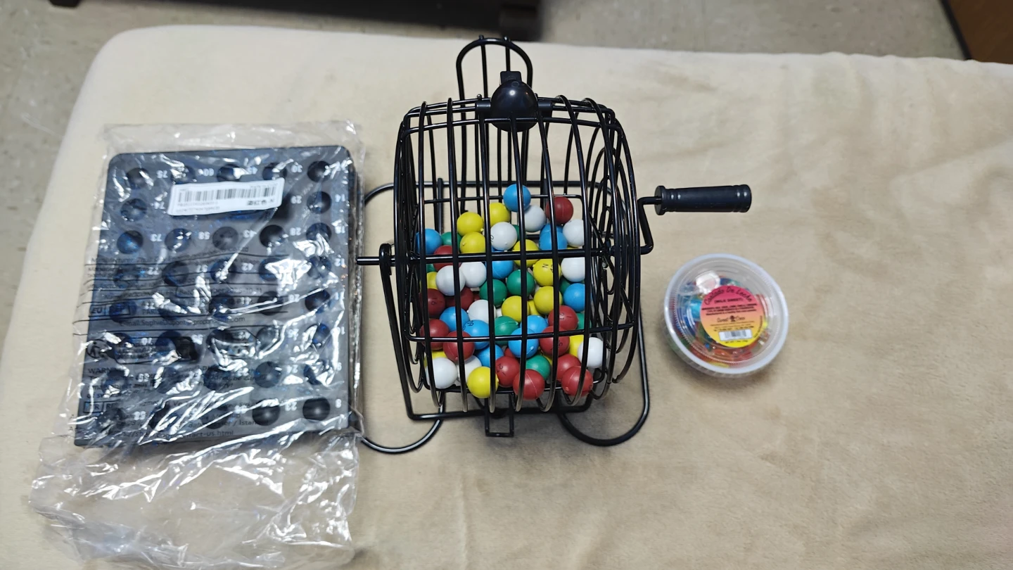 This bingo set includes everything needed for a fun game! It comes with a black cage, colorful bingo balls, and a set of bingo cards. Great for parties or family nights. Get ready for some bingo action!