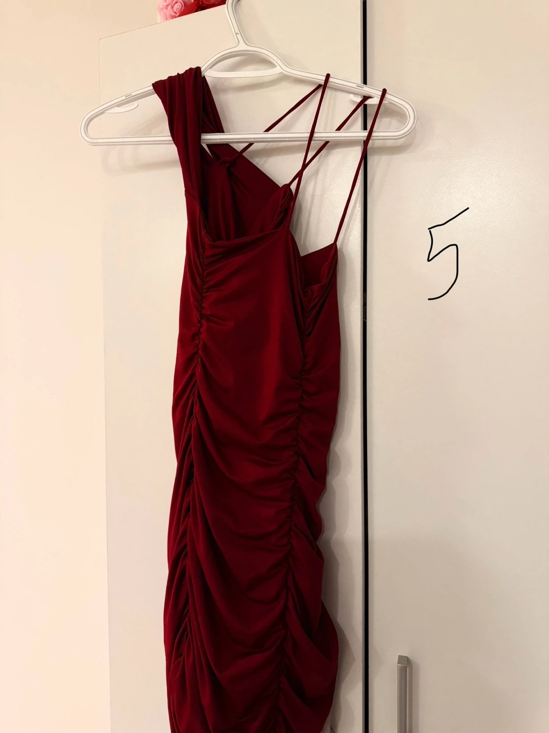 Selling a cute burgundy mini dress! It features an asymmetrical neckline with spaghetti straps and ruched detailing throughout the body of the dress. Perfect for a night out or special occasion