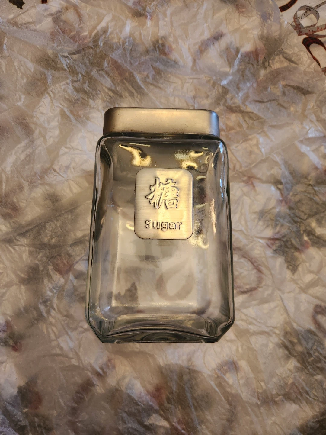 Chinese Character for sugar on a silver label. It's in excellent condition and ready to store your sugar.