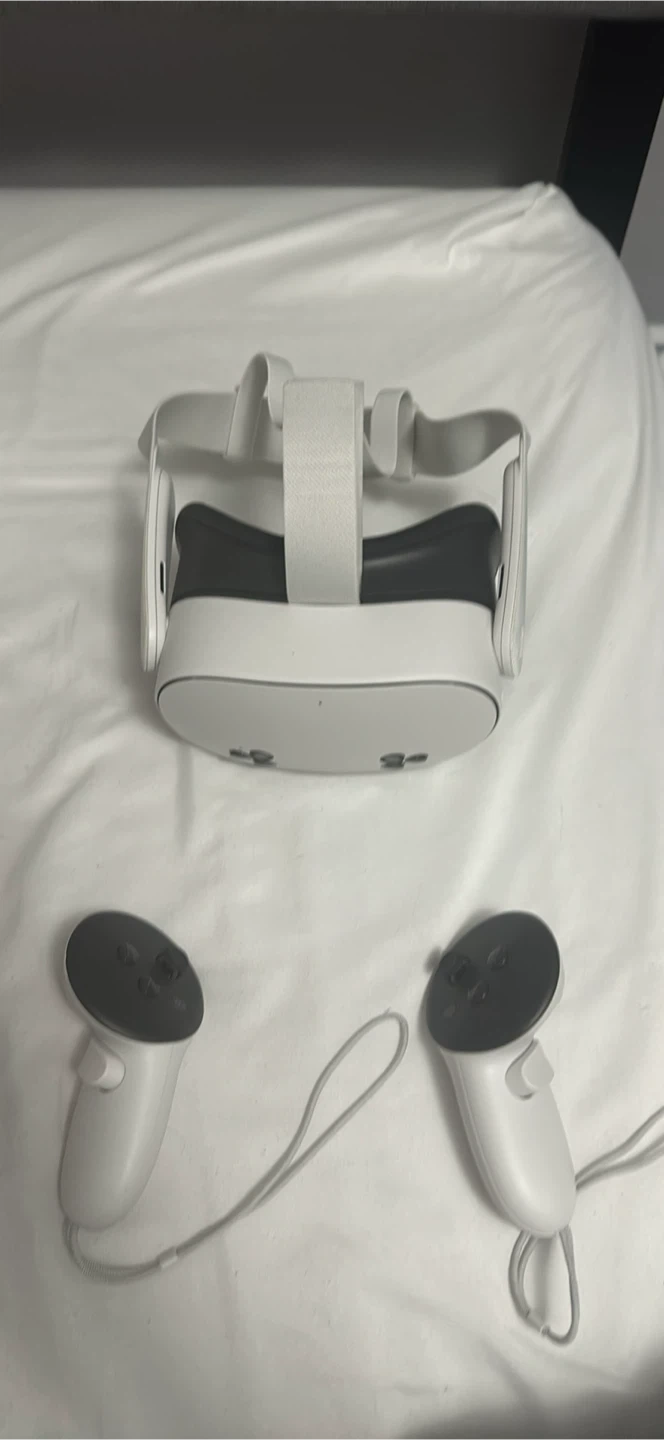 This is an Oculus Quest 3s VR headset and two controllers. It's a standalone device offering immersive virtual reality experiences. Includes the headset and controllers. Its white colour complements many setups.