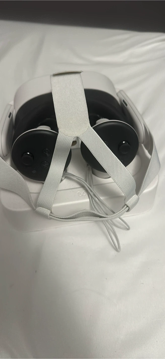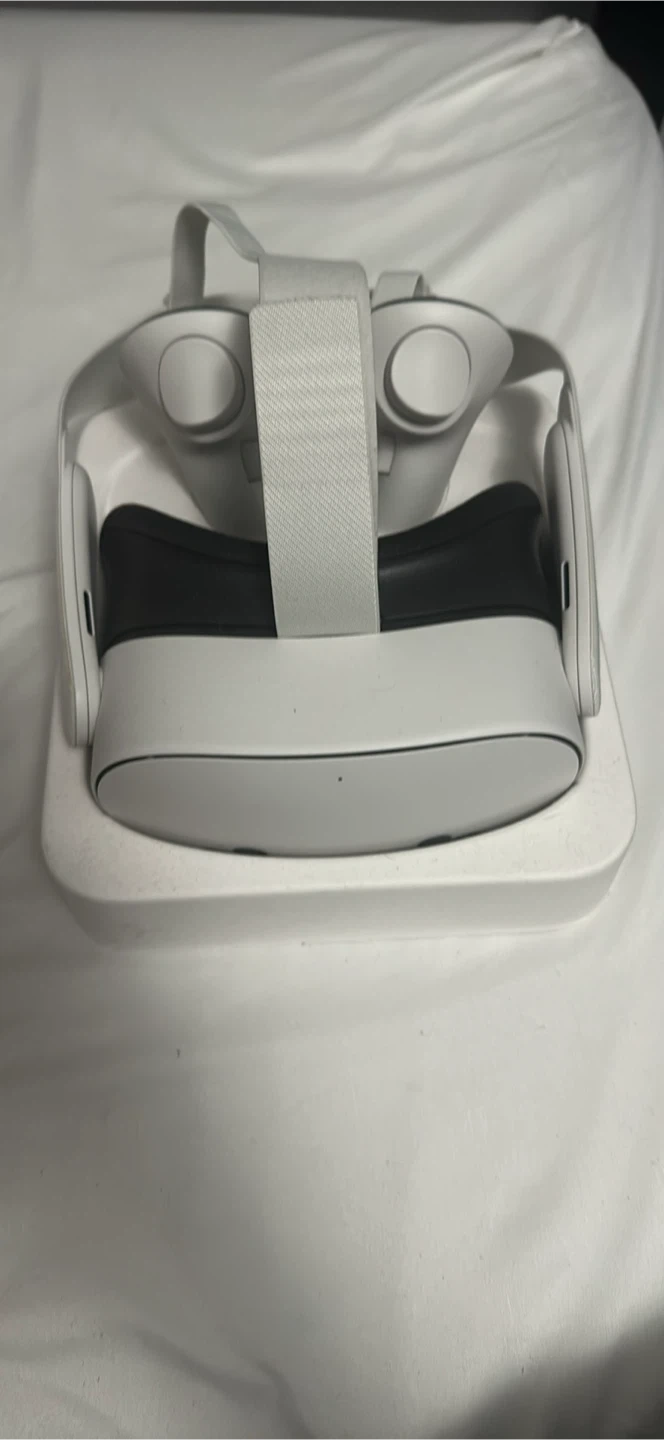 This is an Oculus Quest 3s VR headset and two controllers. It's a standalone device offering immersive virtual reality experiences. Includes the headset and controllers. Its white colour complements many setups.