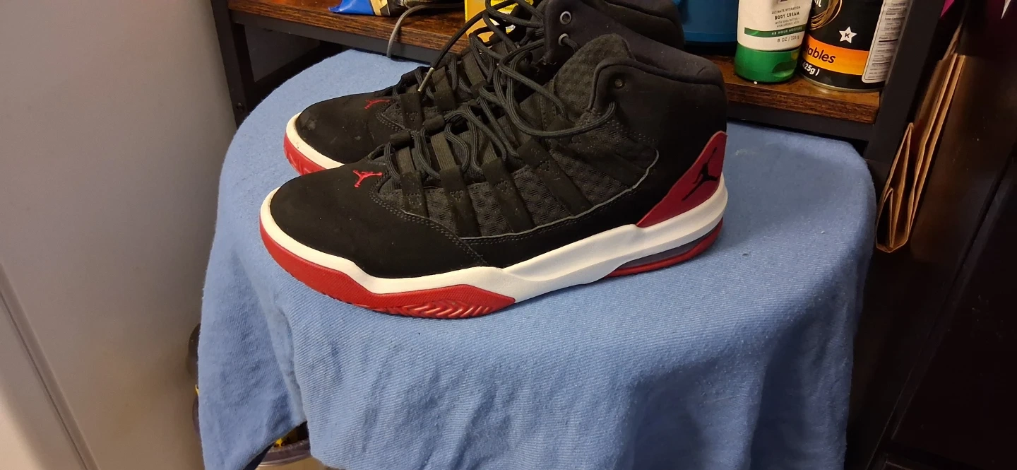 Black and red high-top Jordan basketball shoes. Lace-up closure. Features the iconic Jumpman logo. These sneakers offer good support for athletic activities.