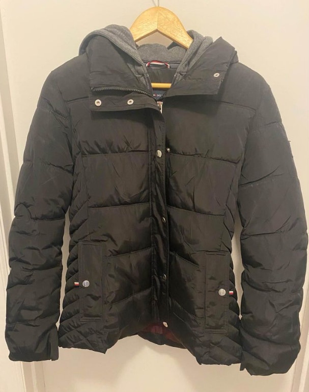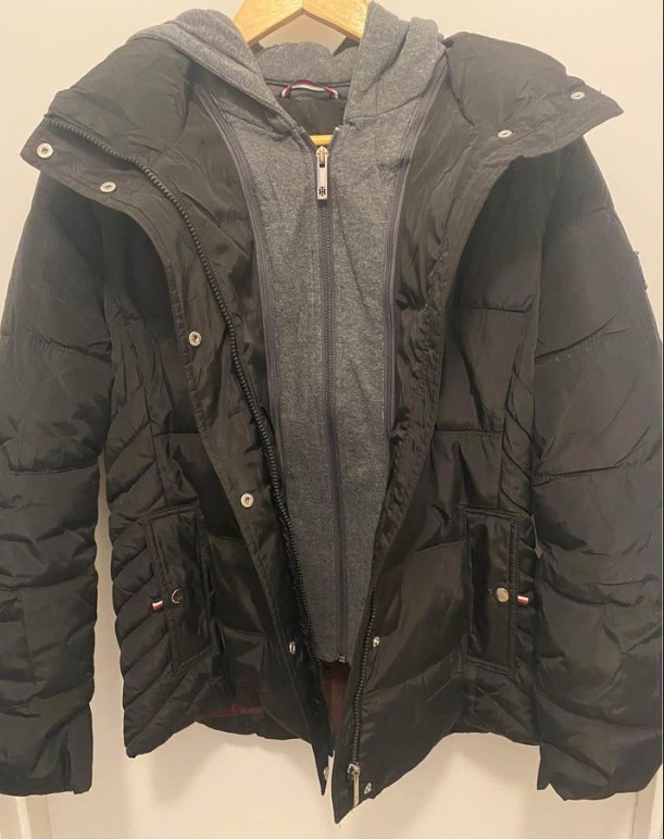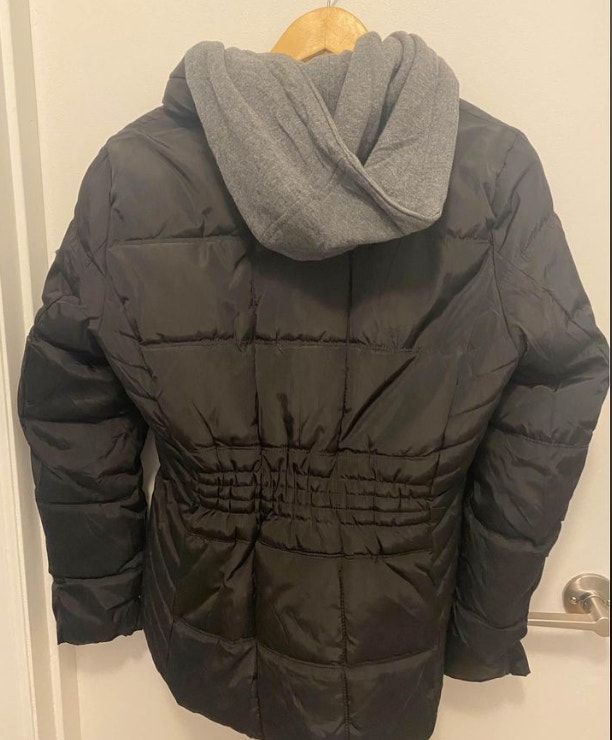 New condition from pet free smoke free home. Black brand name full zip with a removable hood and insert. Does have a full outside zip and snaps for extra warmth. Has 2 pockets on the outside with snap closures. 30” long from the top to the collar to the bottom of the back which is slightly longer than the front. Try ons welcome. Holds with e-transfer only. NSPU. If the ad is up it is available.