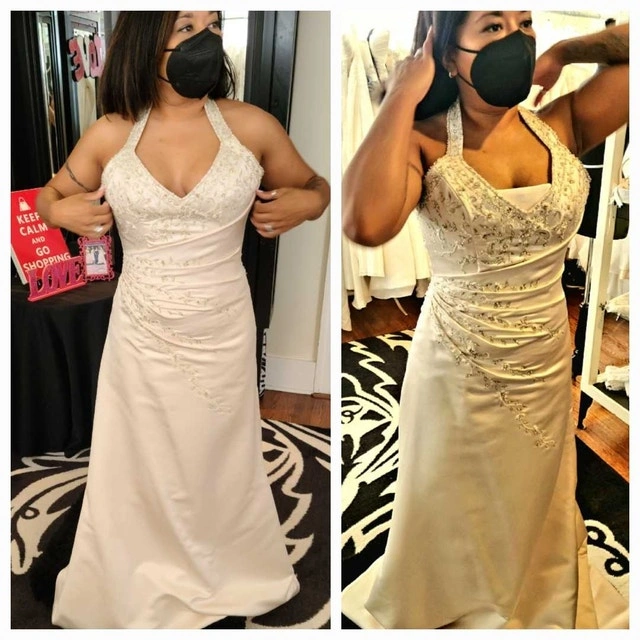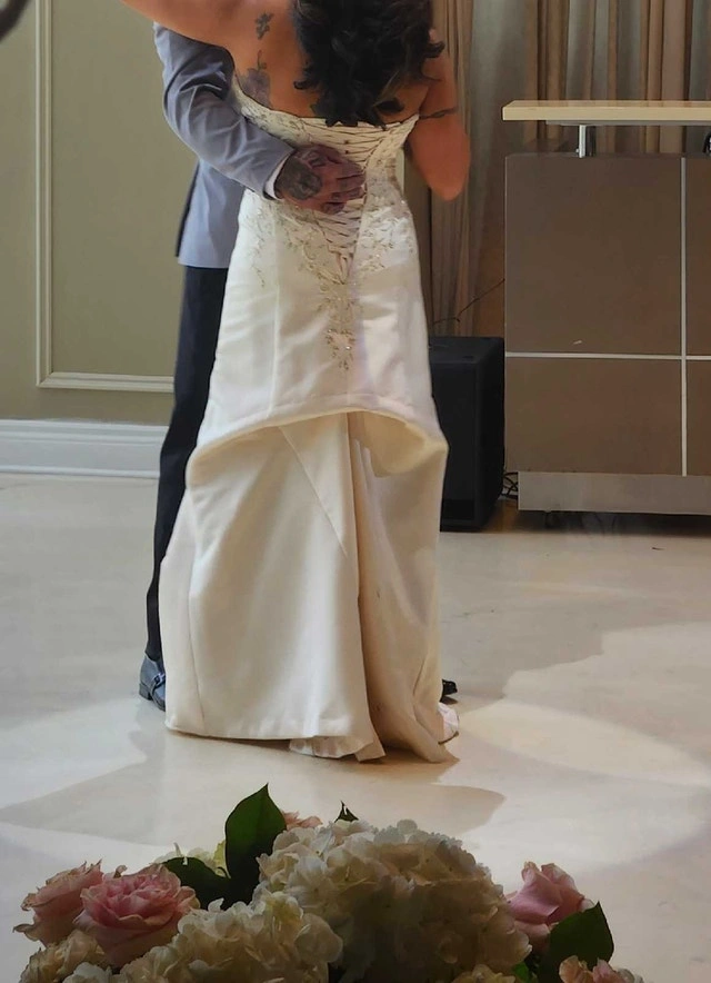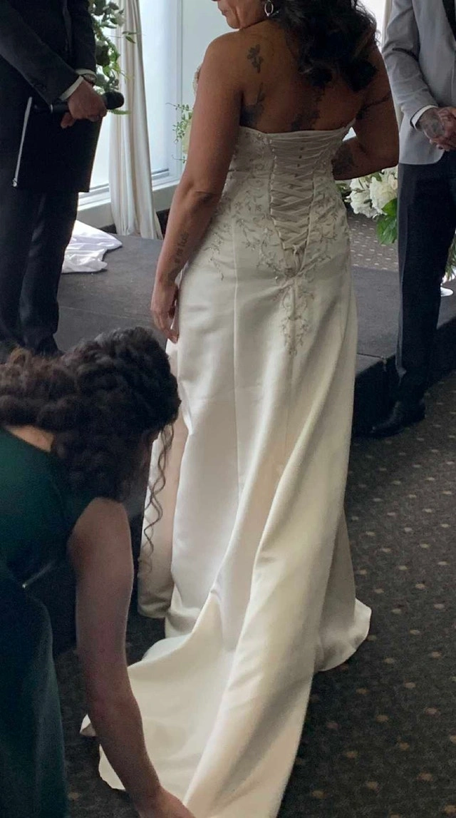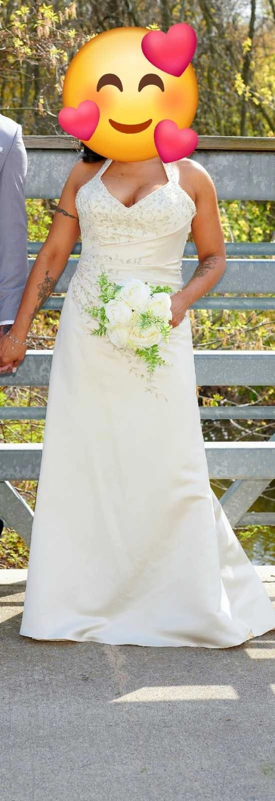 Sample Size 12 (fits like a size 10) Ivory, Halter, with back corset, satin gown with beading on bust and mid-section. Only the hem was altered. I'm 5ft and wore 3" heels. The back has a corset with a removable panel, so it can be worn with or without. Fits great if you have a larger back. It has been dry cleaned and preserved. Asking $600 or best offer. Pick up near Burlington Mall.