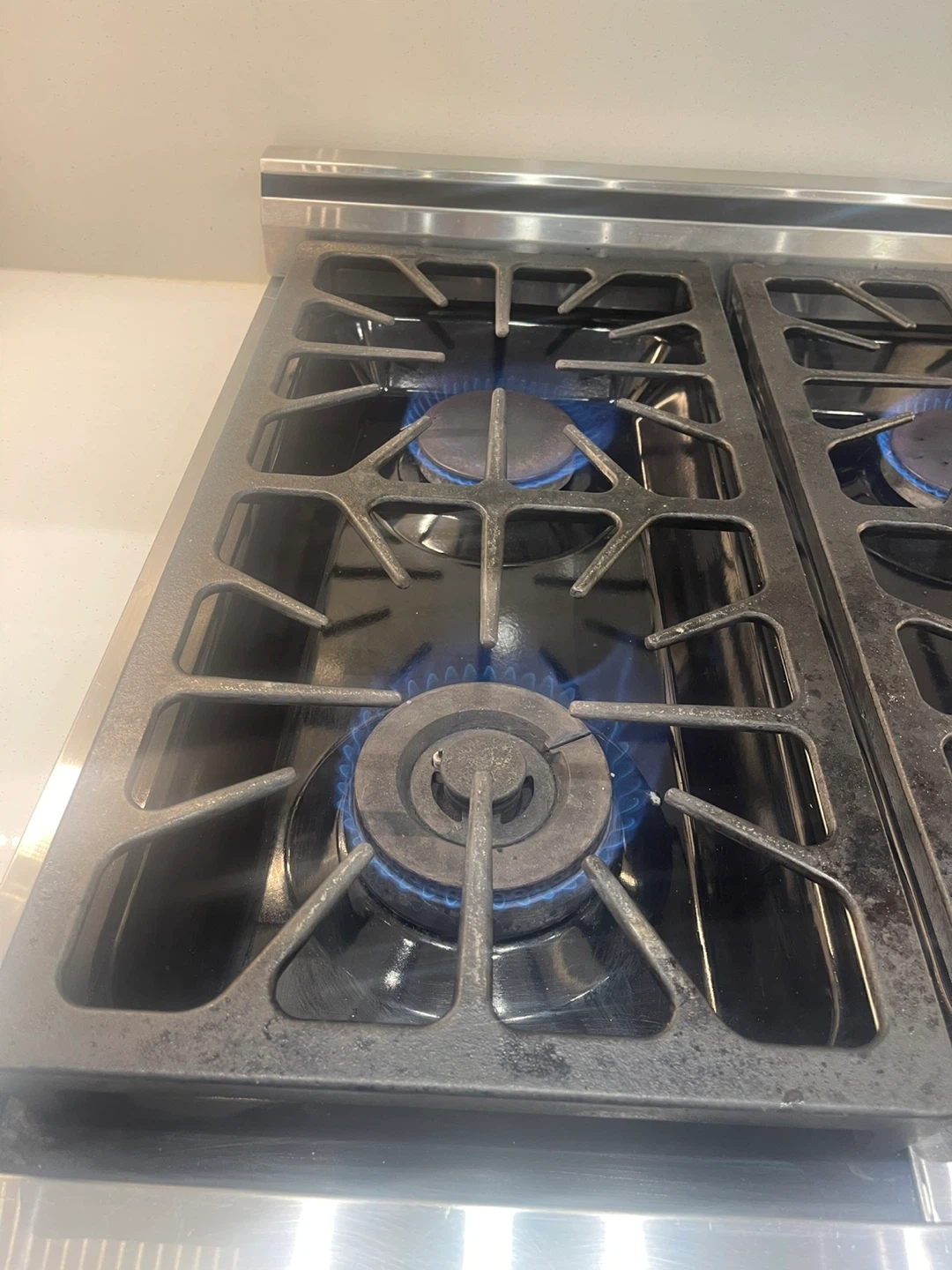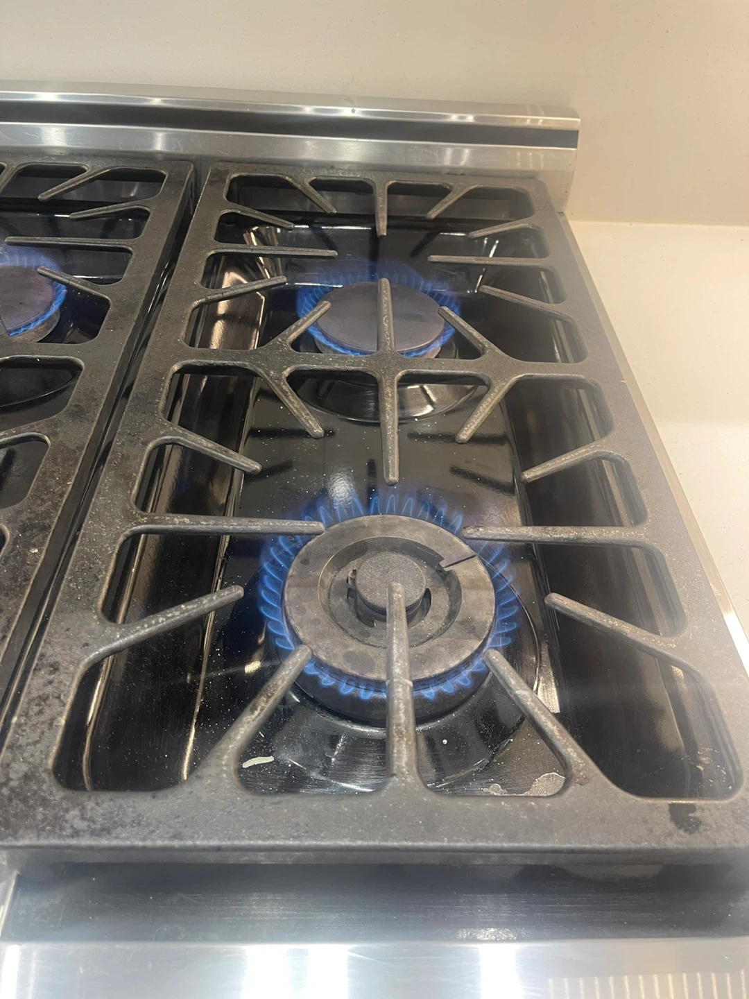 This is a 6-burner gas range with a stainless steel finish. It includes a gas oven with a visible oven rack. The burners are lit and functioning. This range is suitable for a busy kitchen.