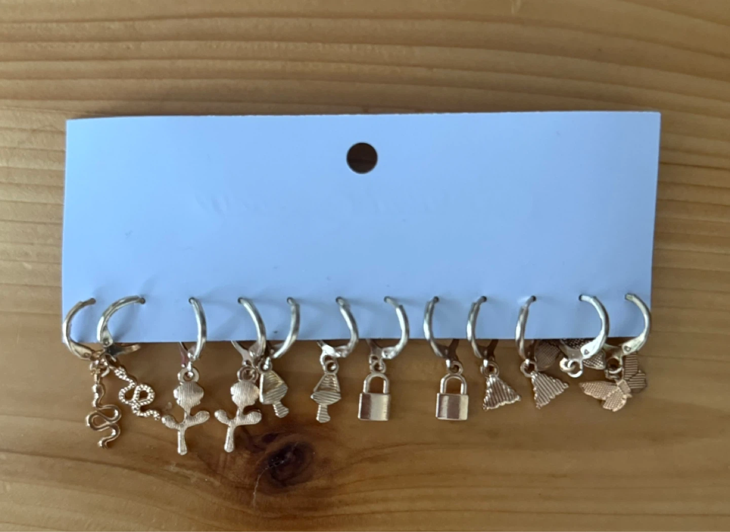 A set of six pairs of hoop earrings with various charms including butterflies, locks, and flowers.