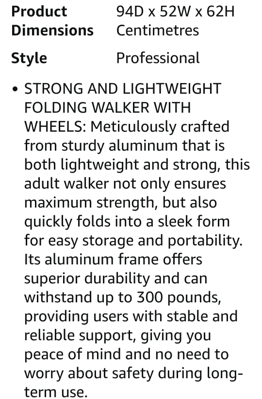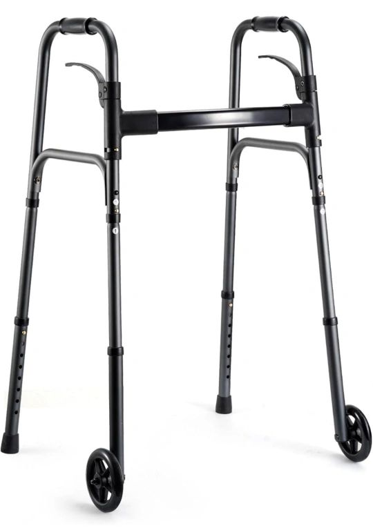 Careboda lightweight FOLDING WALKER in Charcoal Grey. It features 5" fixed wheels and adjustable height. This portable 3 IN ONE Walker is designed for seniors and adults. It has an aluminum frame and supports up to 300 lbs. Easy to fold with one hand