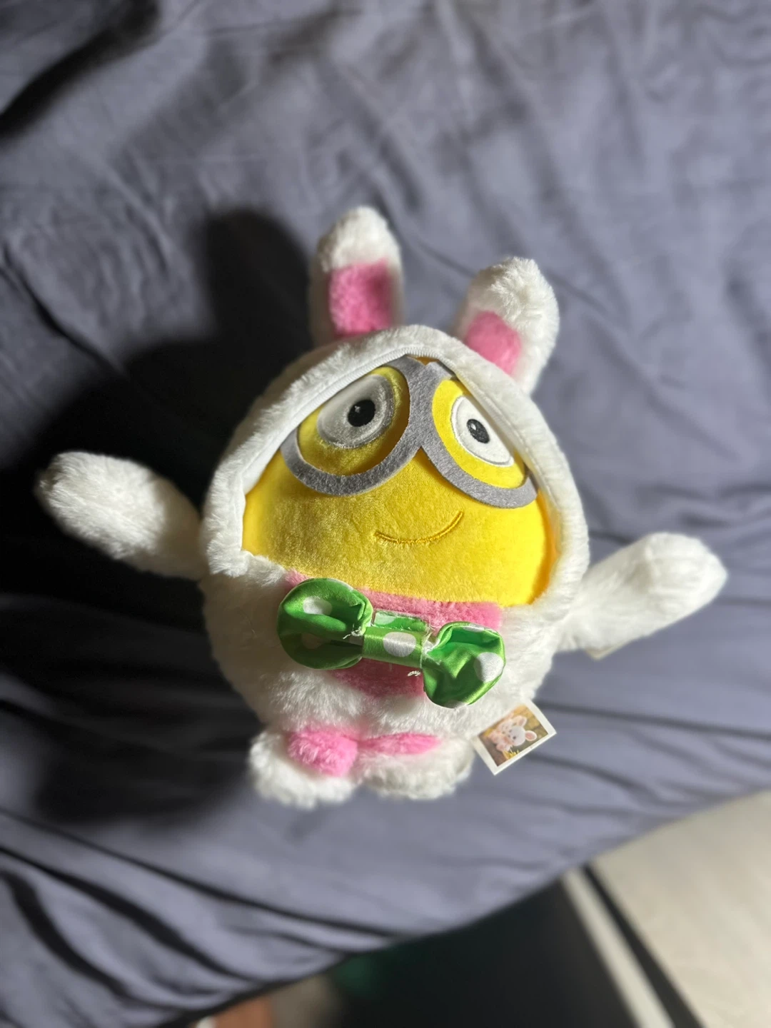 Selling a super cute Minion plushie dressed up as the Easter Bunny! It's in great condition and ready to hop into a new home. This adorable yellow friend is wearing a white bunny suit with pink accents and a green bow tie. Perfect for any Minions fan or Easter enthusiast!