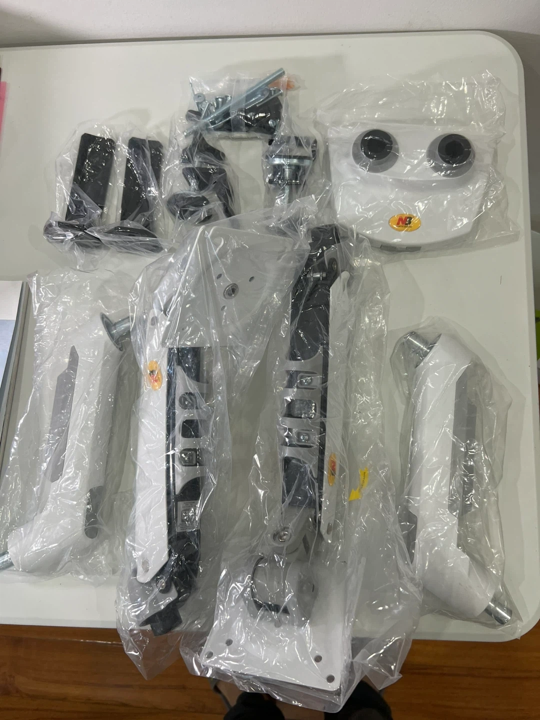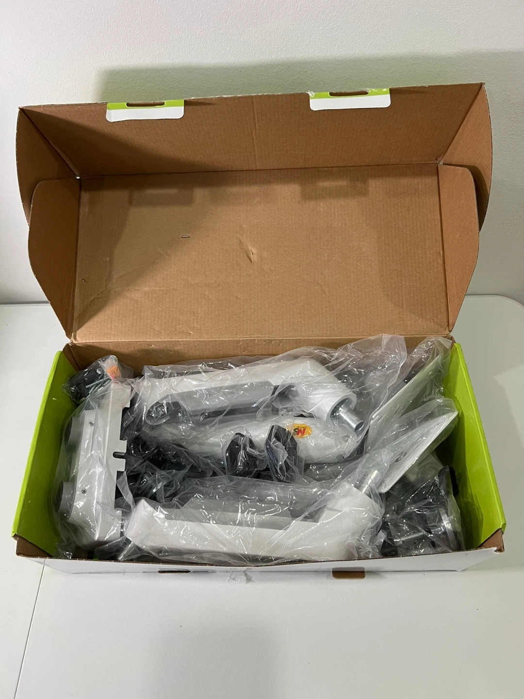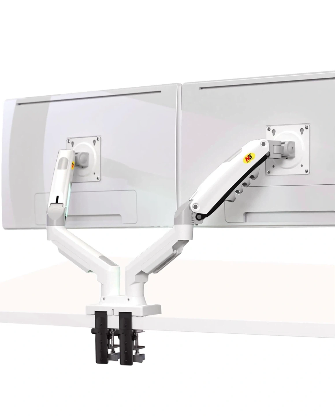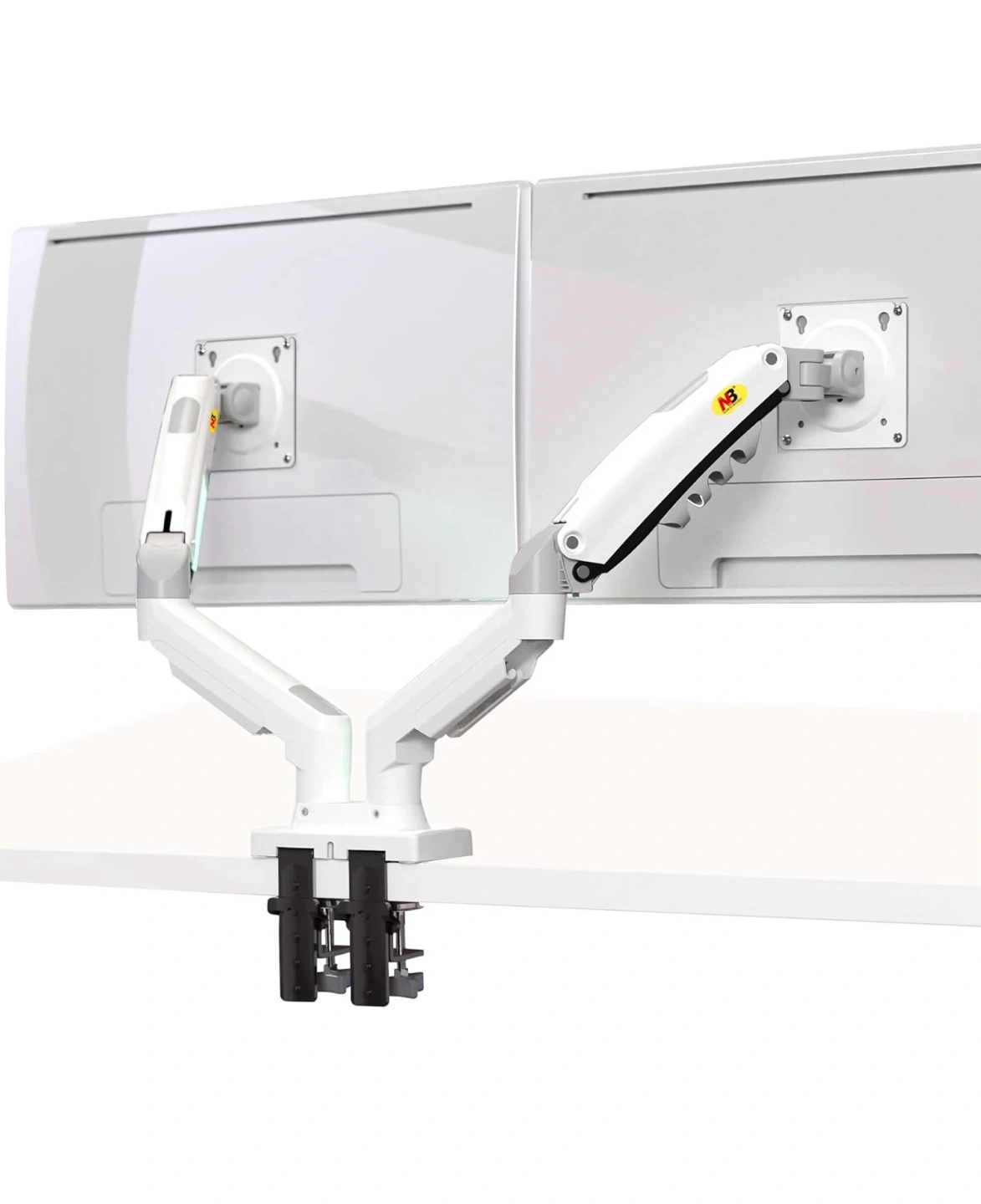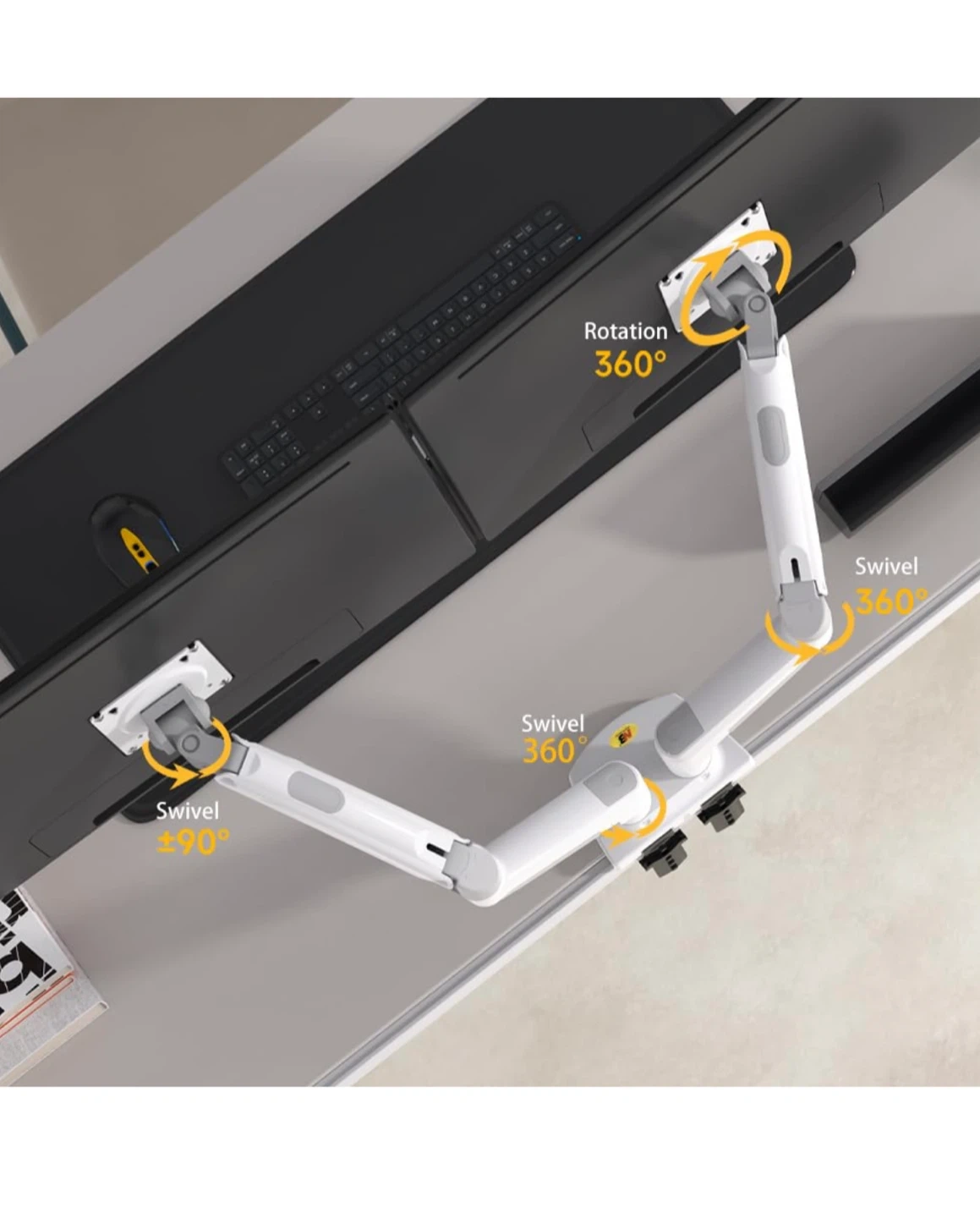 Selling a dual monitor desk mount stand that fits screen sizes from 17" to 27". It can handle a load capacity of 4.4-19.8lbs (2-9kg) and fits VESA sizes 75x75-100x100mm. It also features 360° rotation and cable management