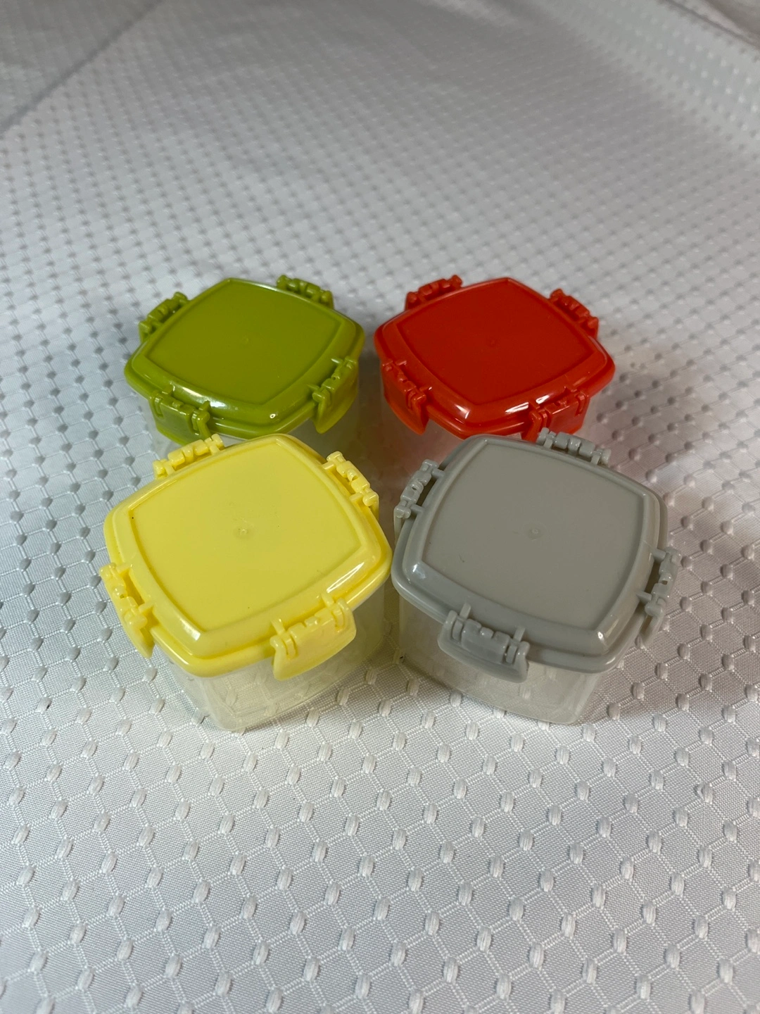 I'm selling a set of four small food storage containers. They come in different colors: green, orange, yellow, and gray. Perfect for snacks or small portions!
