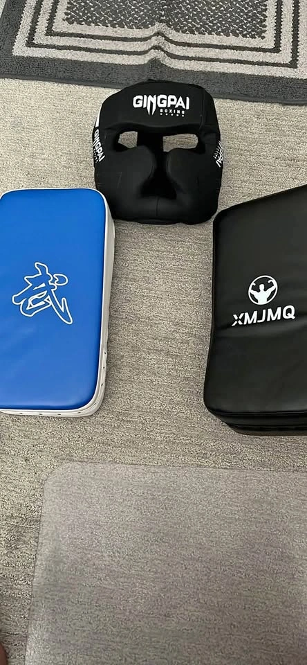 Selling a set of boxing protective gear! Includes a GINGPAI headgear and two kick pads (one blue, one black with the XMJMQ logo). Perfect for sparring and training. $5 for each, $15 for all.