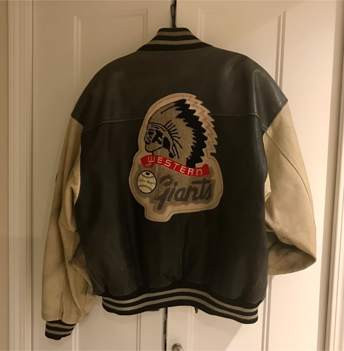 Coat bomber blazer moto motorcycle team sports baseball varsity jacket men’s large size winter autumn fall spring vintage retro antique flight men’s ladies women’s clothing unisex style suede leather designer Western Giants Official League appliqué