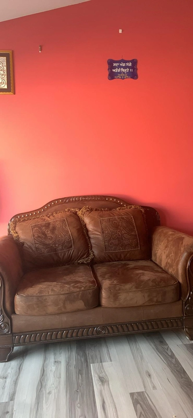 Selling a brown loveseat sofa. It shows some signs of wear, but it's still comfy and has a lot of life left in it. Perfect for a small space!