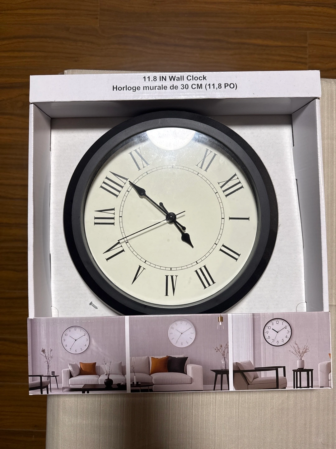 Selling a brand new 11.8 inch wall clock still in its original box! It features a classic design with Roman numerals, perfect for adding a touch of elegance to any room. The clock is black with a white face.