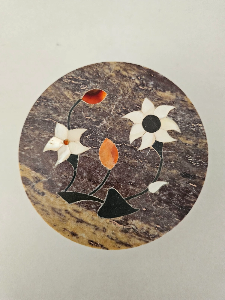 Here's a lovely little round trinket box made of soapstone! It has a beautiful mother of pearl floral inlay design on the lid. Perfect for storing small items or as a decorative piece!