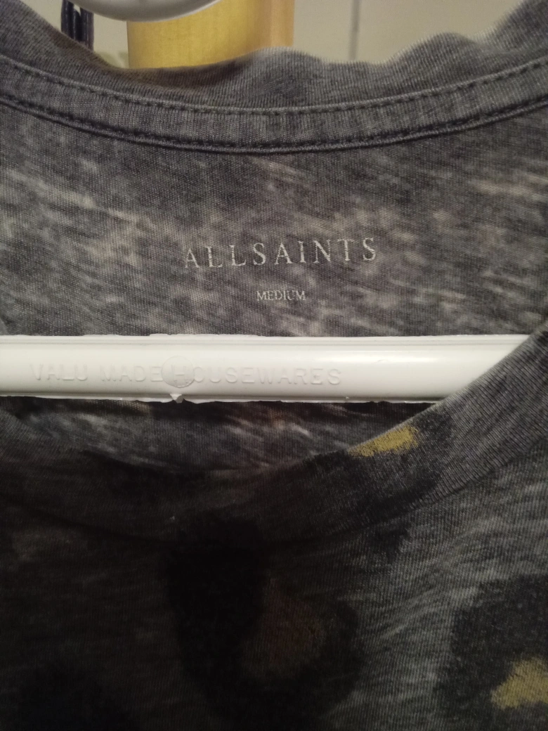 277AllSaints t-shirt in size medium. The shirt is grey and features a unique animal print design. It's in good condition and ready for a new home!