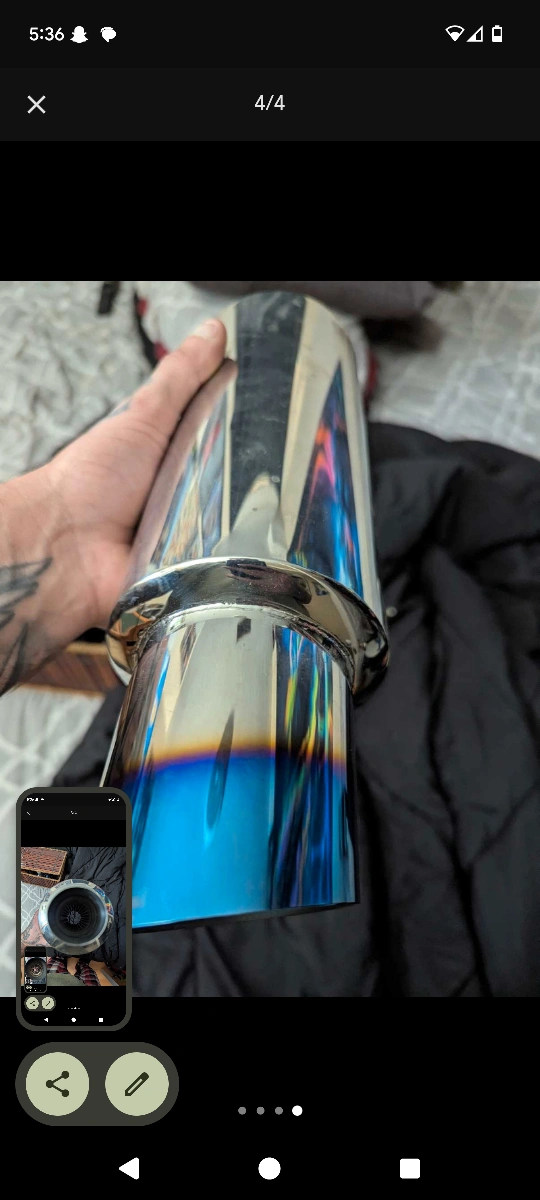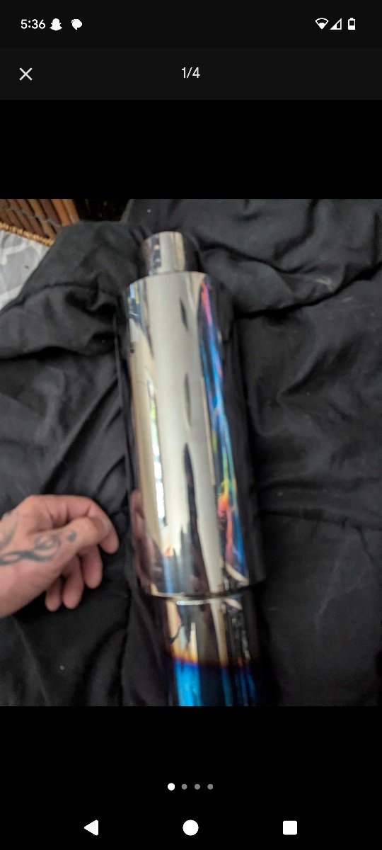 Selling a car muffler exhaust tip. It has a blue and silver finish. Please take a look at the pictures to see the condition