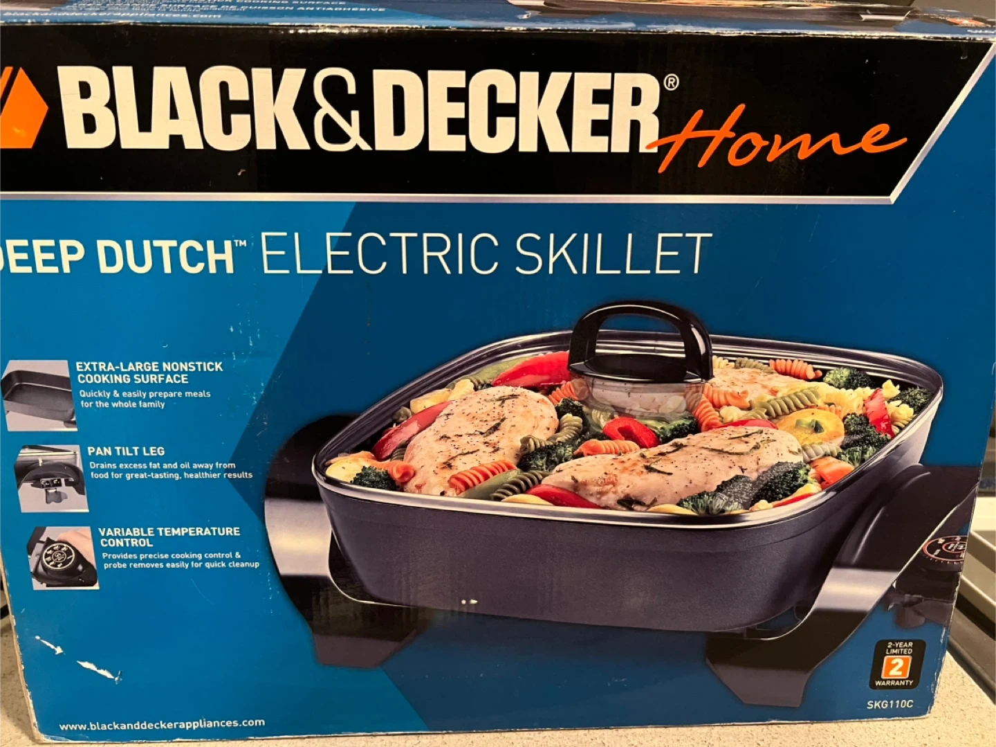 I'm selling a rarely used (2x) Black & Decker Deep Dutch Electric Skillet! It has a nonstick 12" cooking surface and variable temperature control. The pan also has a tilt leg to drain excess fat. It comes with a tempered glass lid and a heavy-duty base. The box is included!