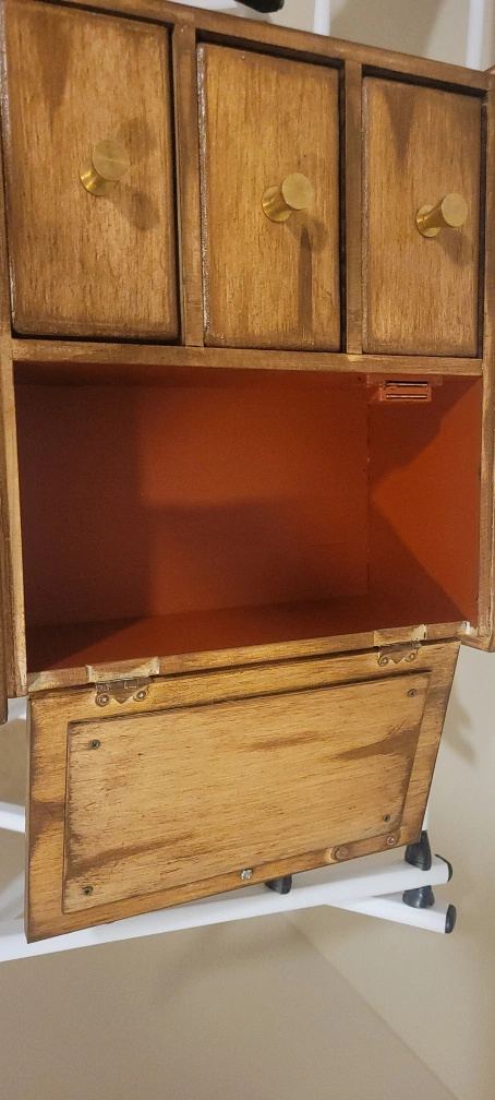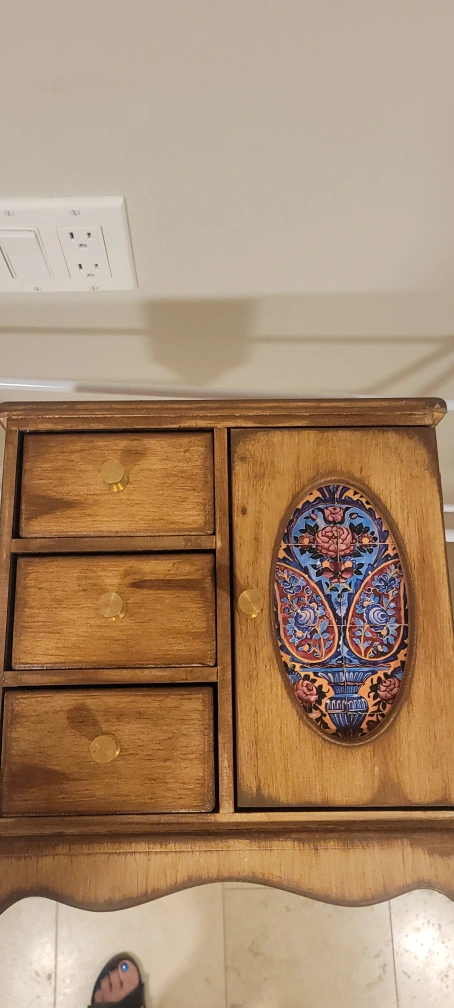 Selling a charming wooden jewelry box with a unique design! It features several drawers and a cabinet, perfect for organizing your precious items. The wood has a lovely warm tone, and the decorative panel adds a touch of elegance. It's in great condition and ready to find a new home