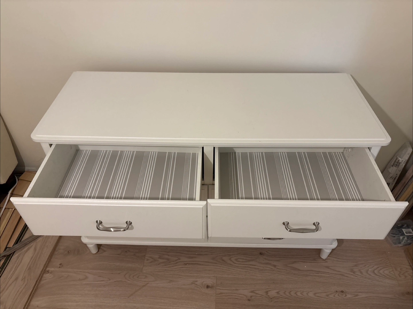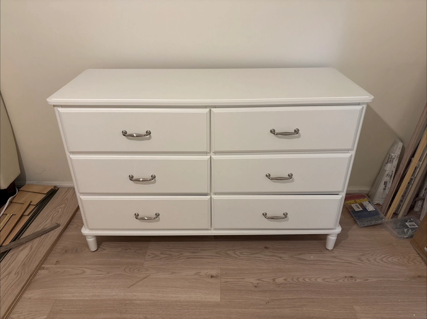 Selling a lovely white dresser with six drawers! It's in great condition and ready for a new home. The inside of the drawers are lined with a cute striped pattern. Perfect for adding storage to any room