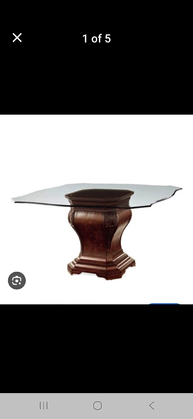 Selling a dining table with a glass top and a beautifully carved wood base. It's in good condition and would be a great addition to any dining room. The chairs in the photos are also available if you're interested for $180