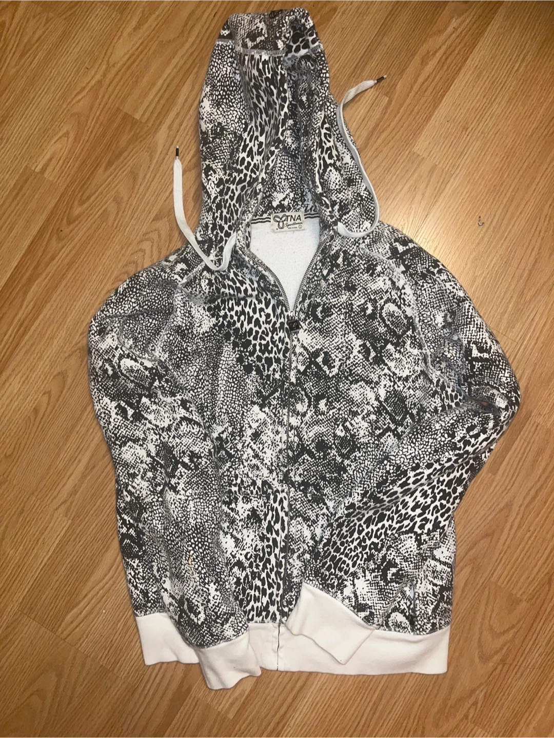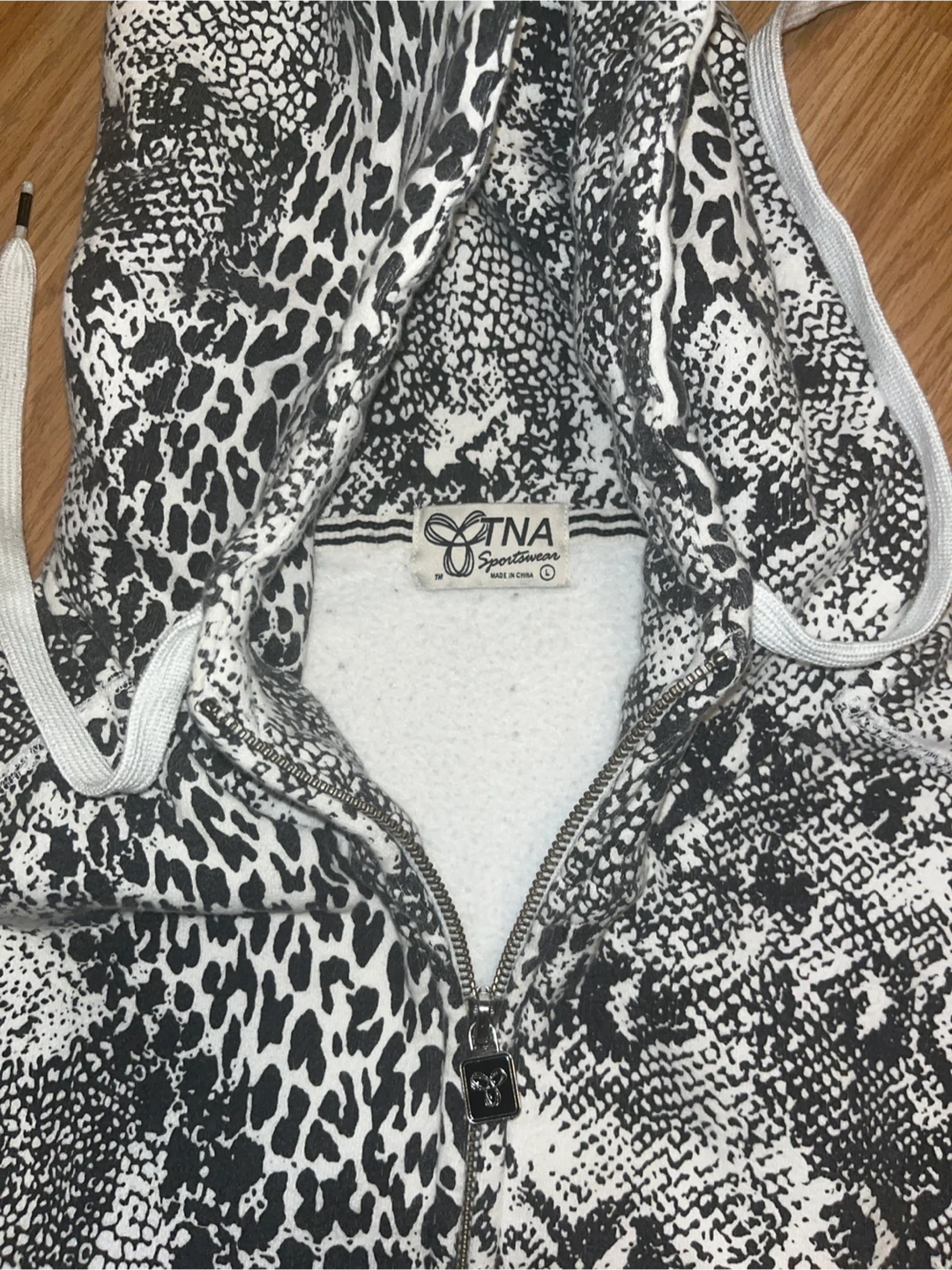 Make offer! Cozy TNA full-zip hoodie in a unique black and white animal print! It's a size large and features a comfortable fit. Perfect for layering or wearing on its own. Wore a few times. Don’t reach for it anymore.