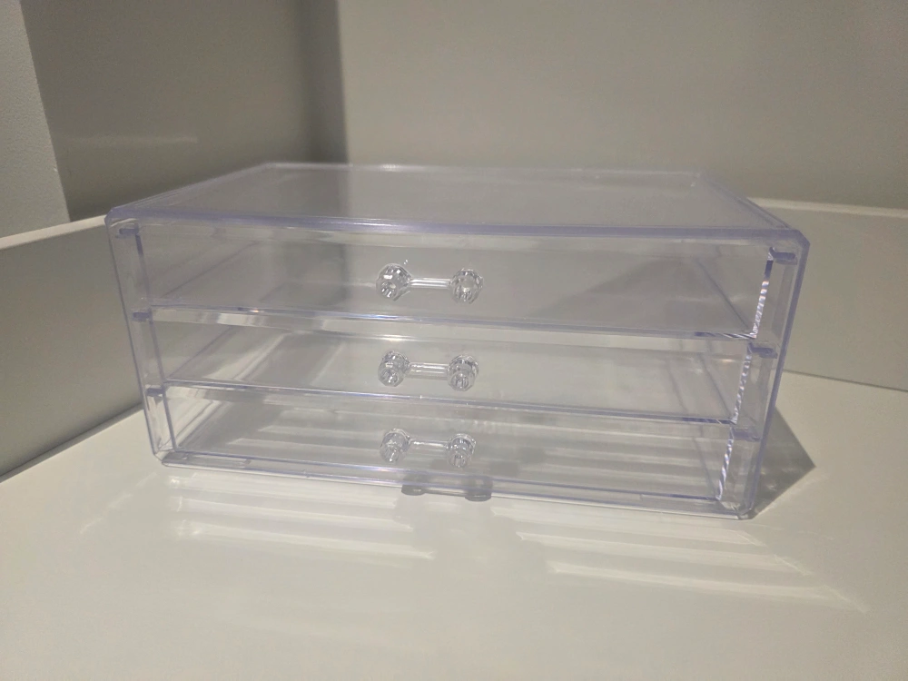 Here's a handy clear acrylic organizer with three drawers! It's perfect for storing makeup, skincare, or other small items. The clear design makes it easy to see what's inside