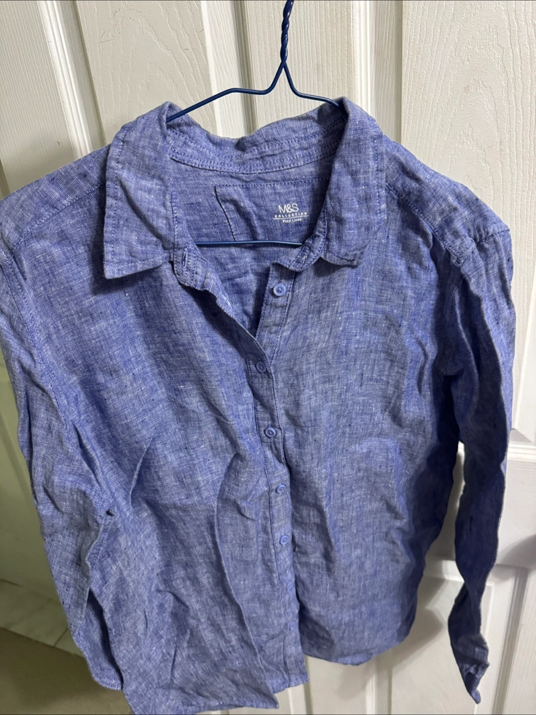 Here's a lovely blue linen shirt from M&S Collection! It's in great shape and ready for a new home. Perfect for staying cool and stylish during warmer weather.