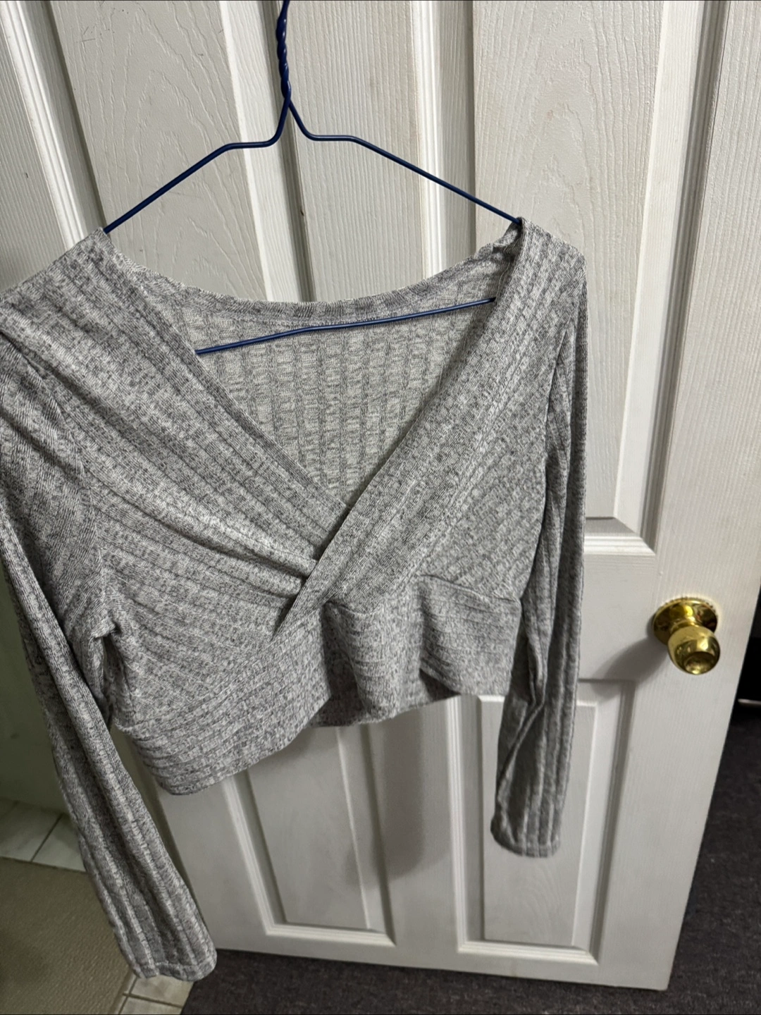 Here's a cute grey long sleeve crop top! It has a unique twisted front design and a ribbed texture. Perfect for layering or wearing on its own