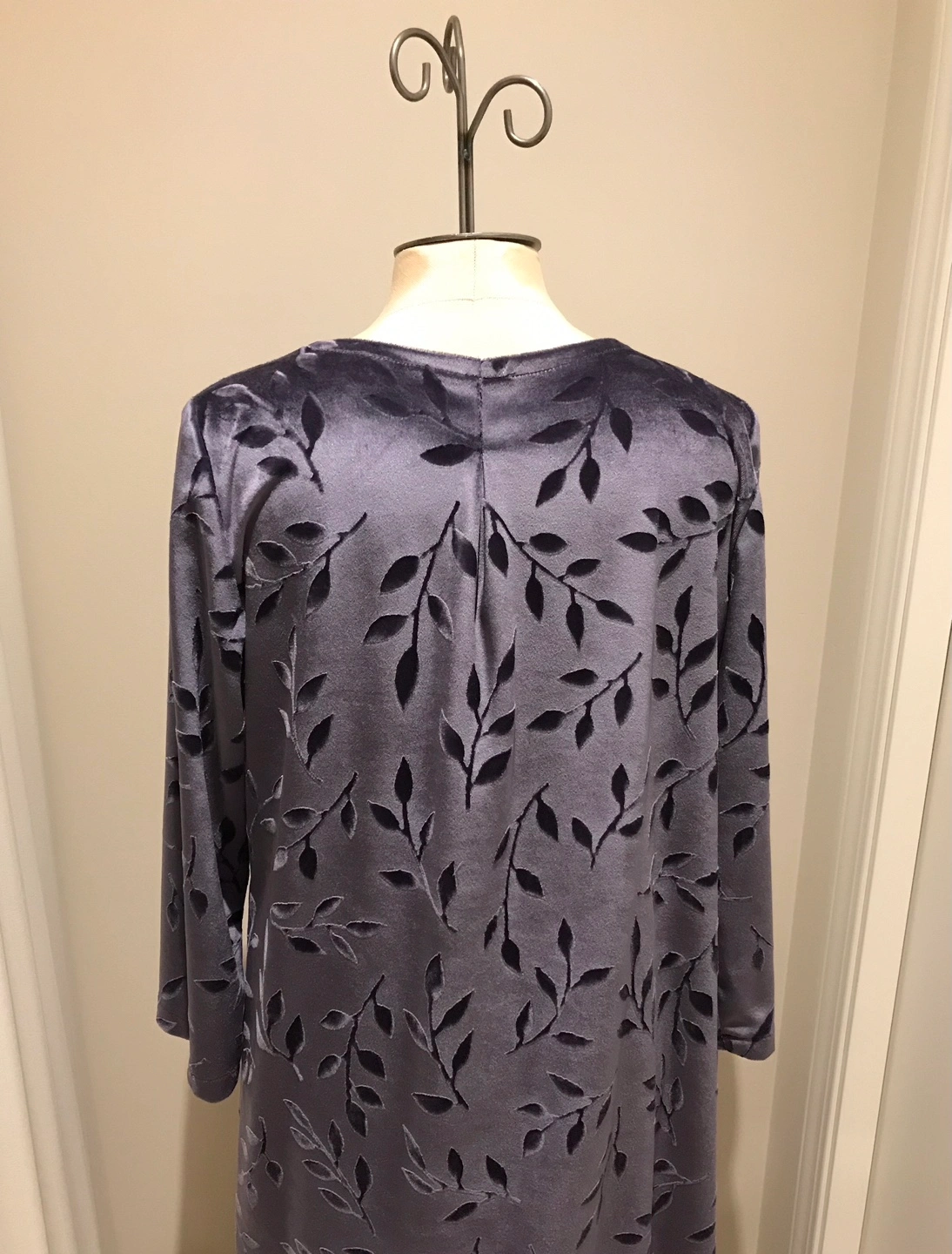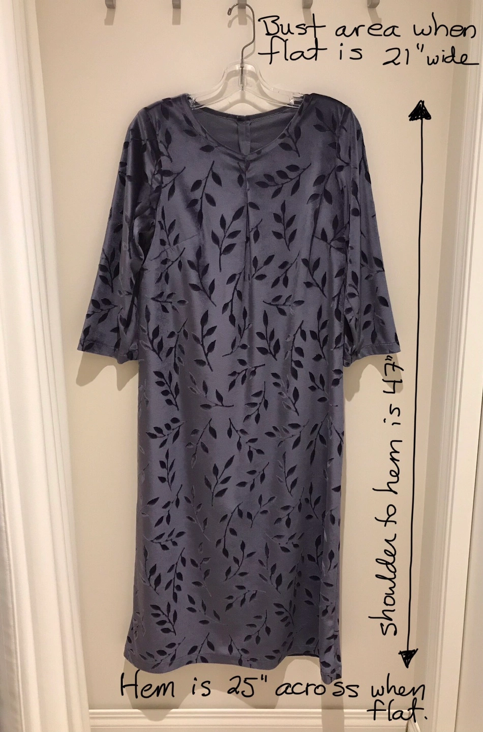 This is a beautiful mauve floral velvet dress in excellent condition! This custom sewn tunic dress is a size medium. The bust area when flat is 21" wide, and the length from shoulder to hem is 47". The hem is 25" across when flat. Like new! It's a lovely piece for any occasion!