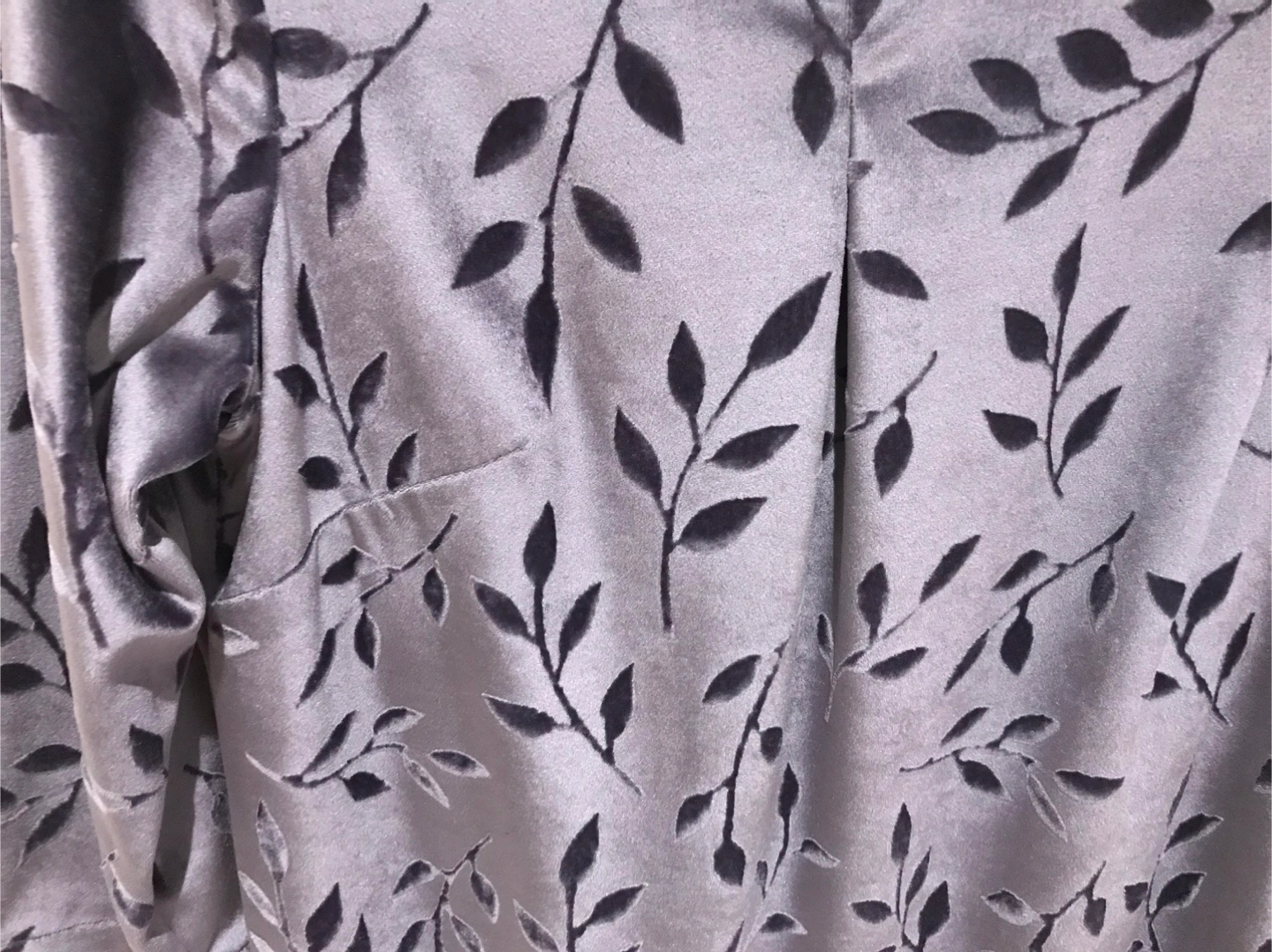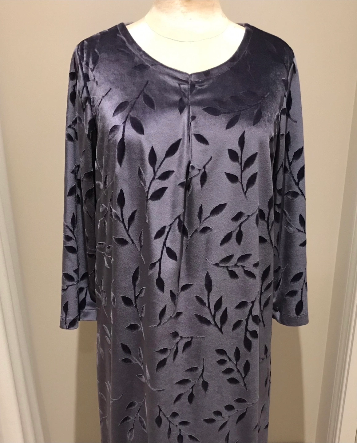 This is a beautiful mauve floral velvet dress in excellent condition! This custom sewn tunic dress is a size medium. The bust area when flat is 21" wide, and the length from shoulder to hem is 47". The hem is 25" across when flat. Like new! It's a lovely piece for any occasion!