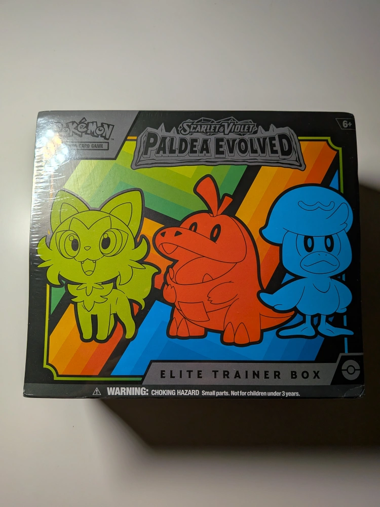 Selling a brand new Pokémon Scarlet & Violet Paldea Evolved Elite Trainer Box! It's still sealed in its original packaging. Perfect for collectors or players looking to expand their collection!
