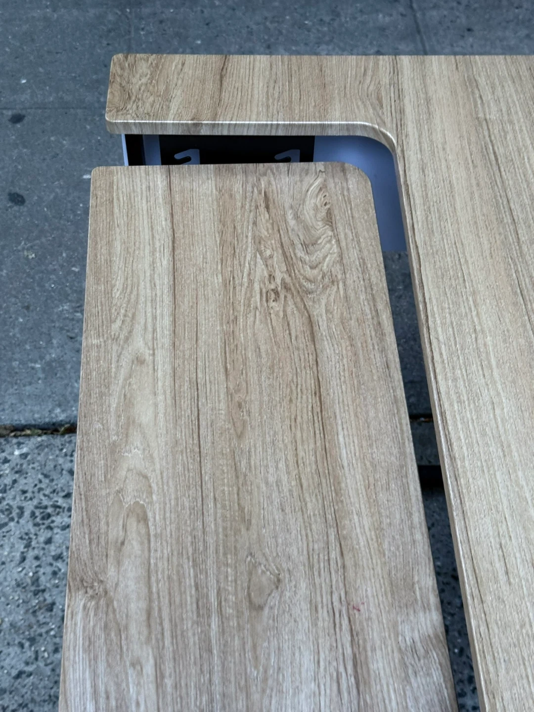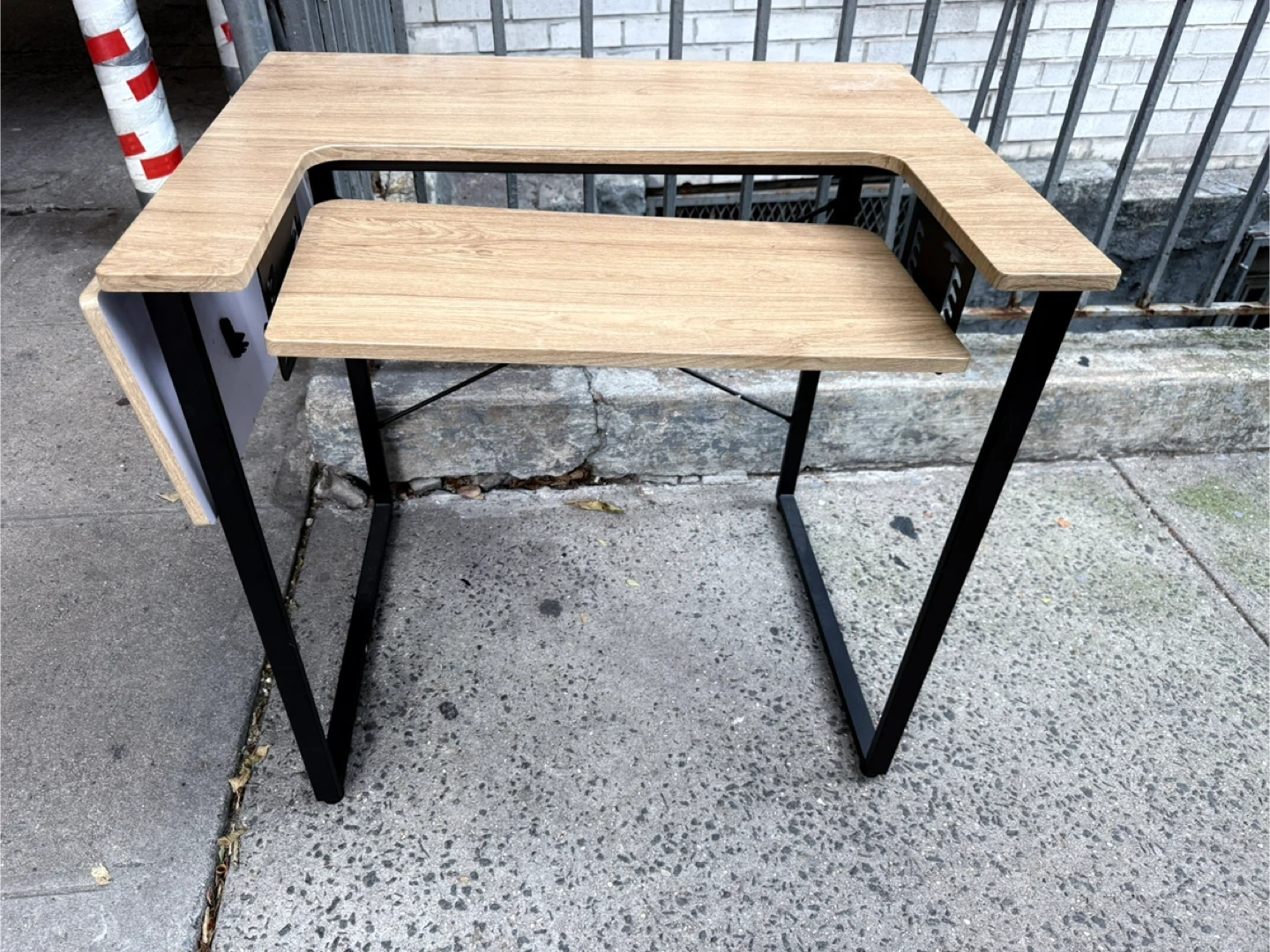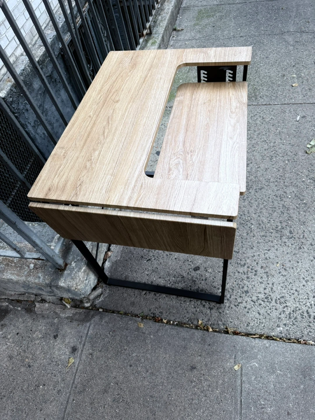 Free a desk with a light wood top and black metal frame. It features a unique design with a cutout and a sliding shelf for your keyboard. Perfect for a small workspace! Curb pickup outside of school on W 96th St.