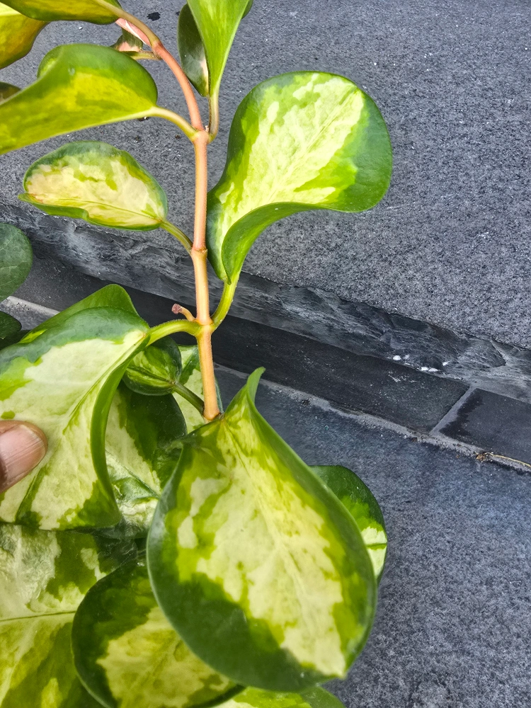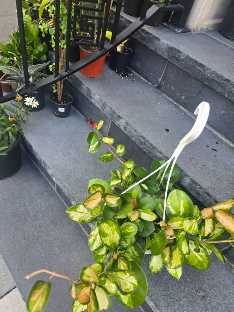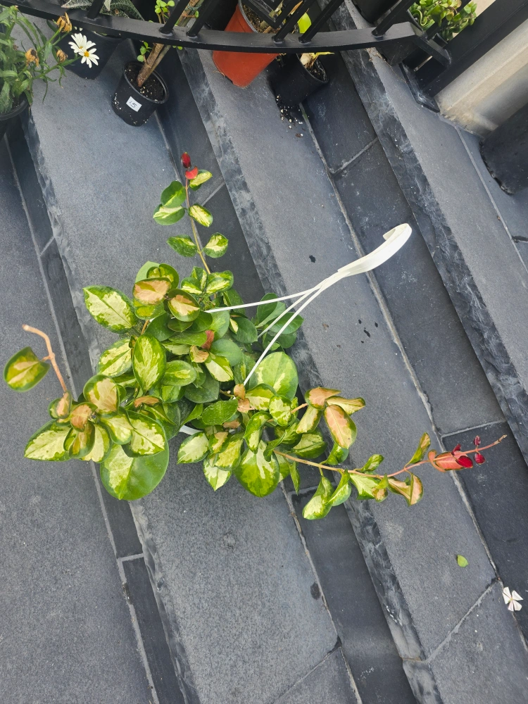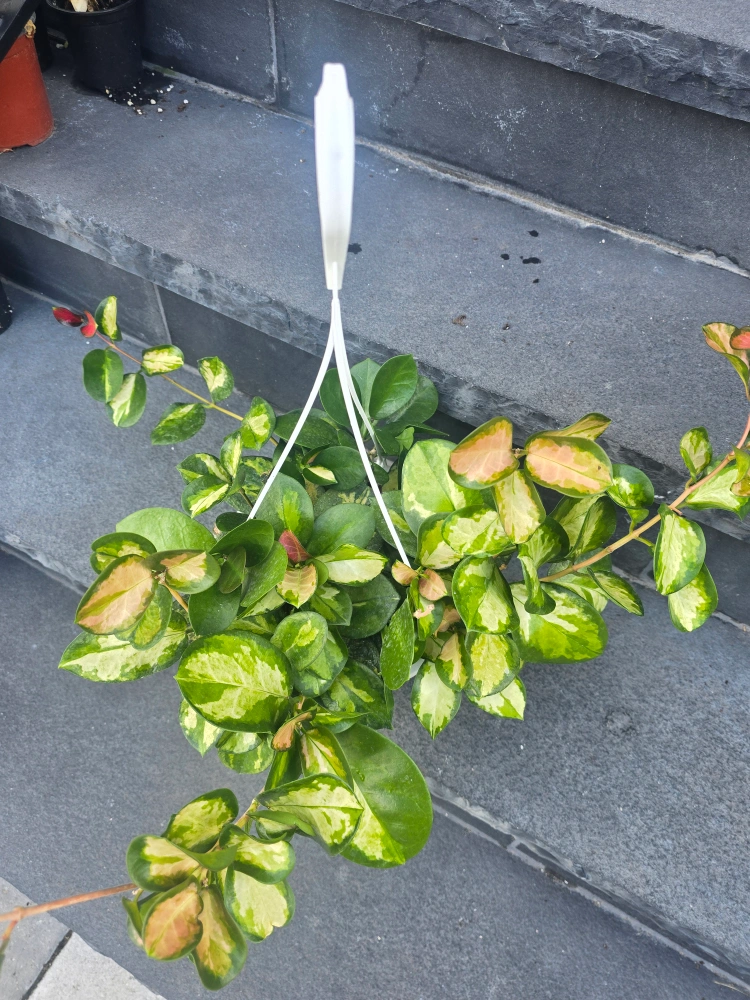 257Selling a beautiful Hoya Carnosa Tricolor plant! It has lovely green and cream variegated leaves with hints of pink. It's a healthy plant and comes in a hanging pot, ready to brighten up your space
